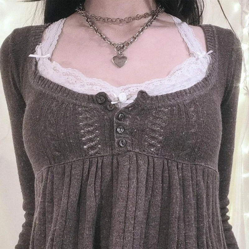 2000s Vintage Long Sleeve Babydoll Knitted Sweater Tops Cottage Milkmaid Pullovers Aesthetic Grunge Y2k Knitwear T-shirts Women
