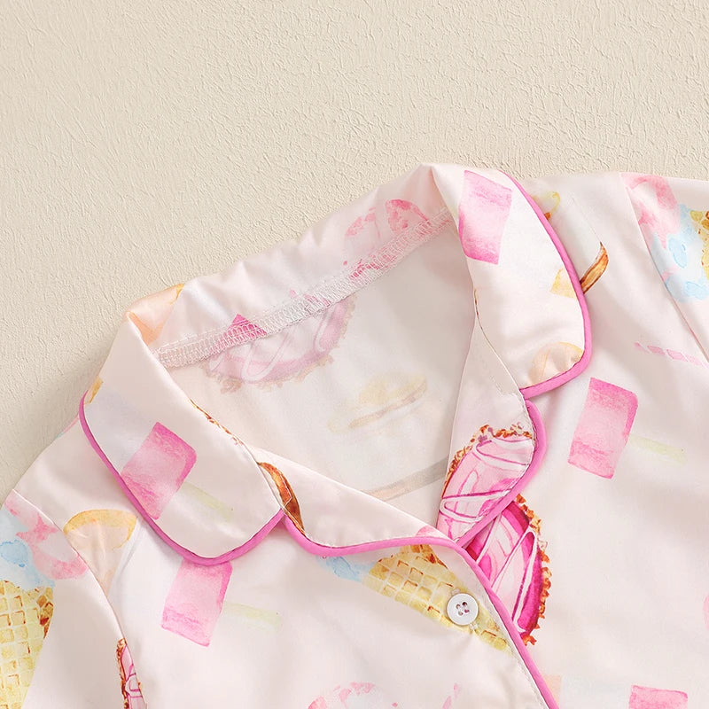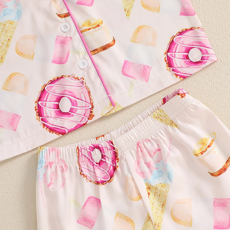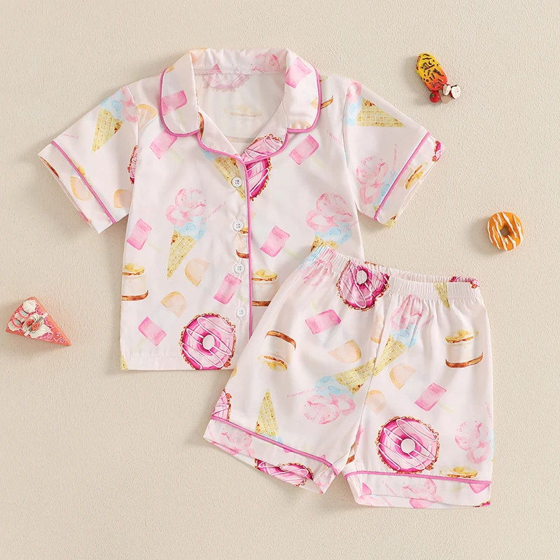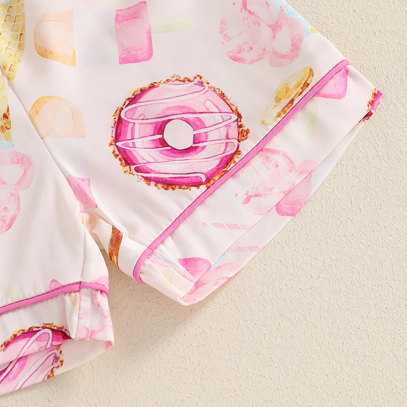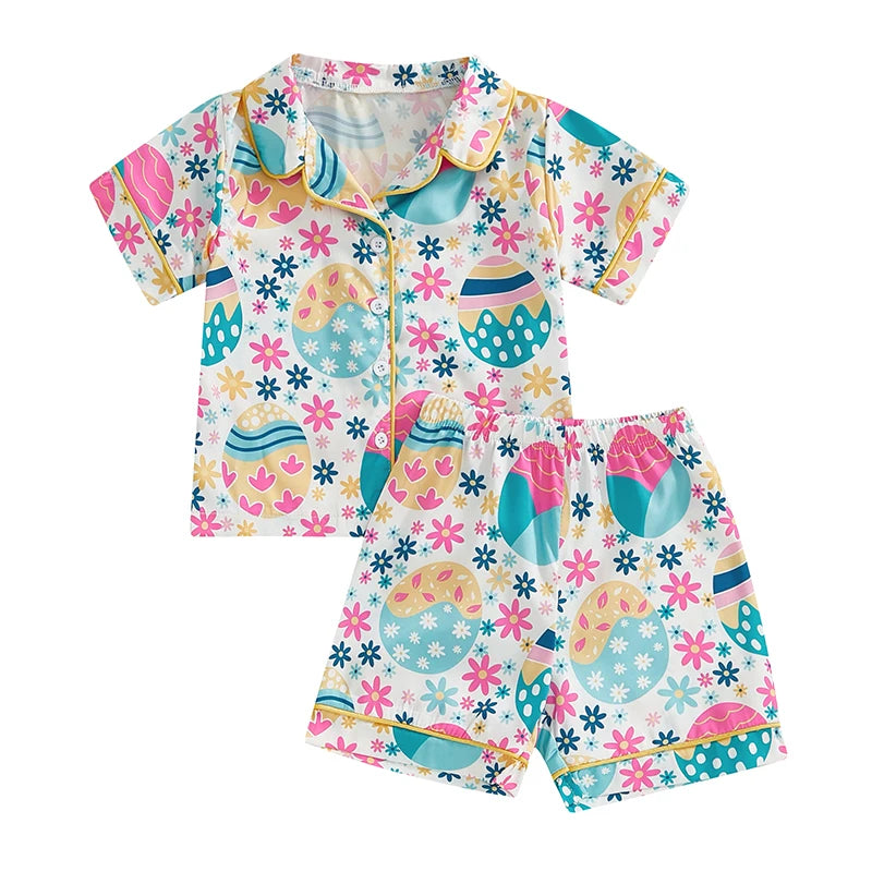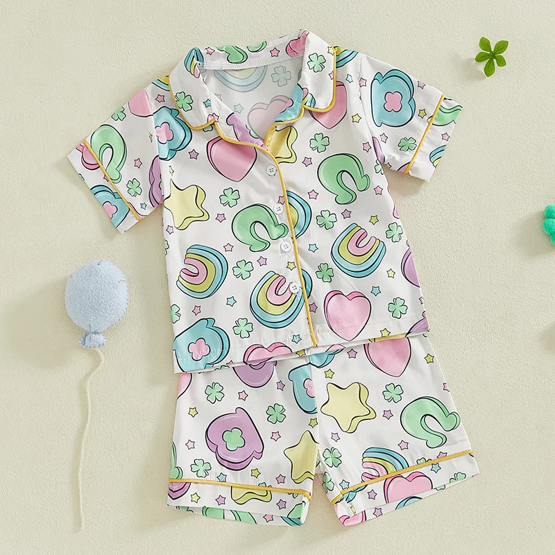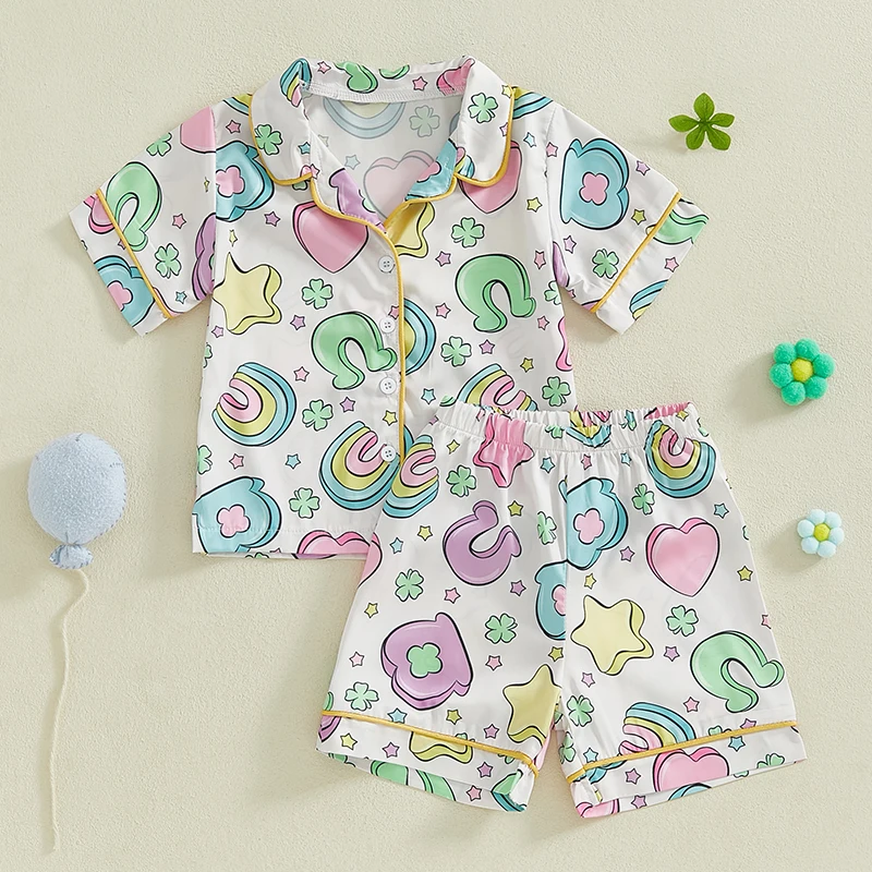 Girls 2PCS Pajama Sets Short Sleeve Lapel Button Up Dount/Clover/Egg/Leopard Heart Print Shirt Shorts SleepwearSize (cm)