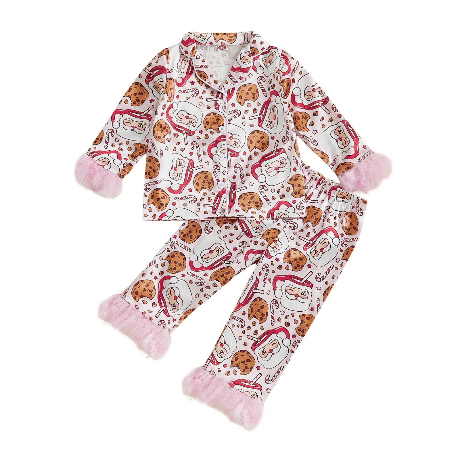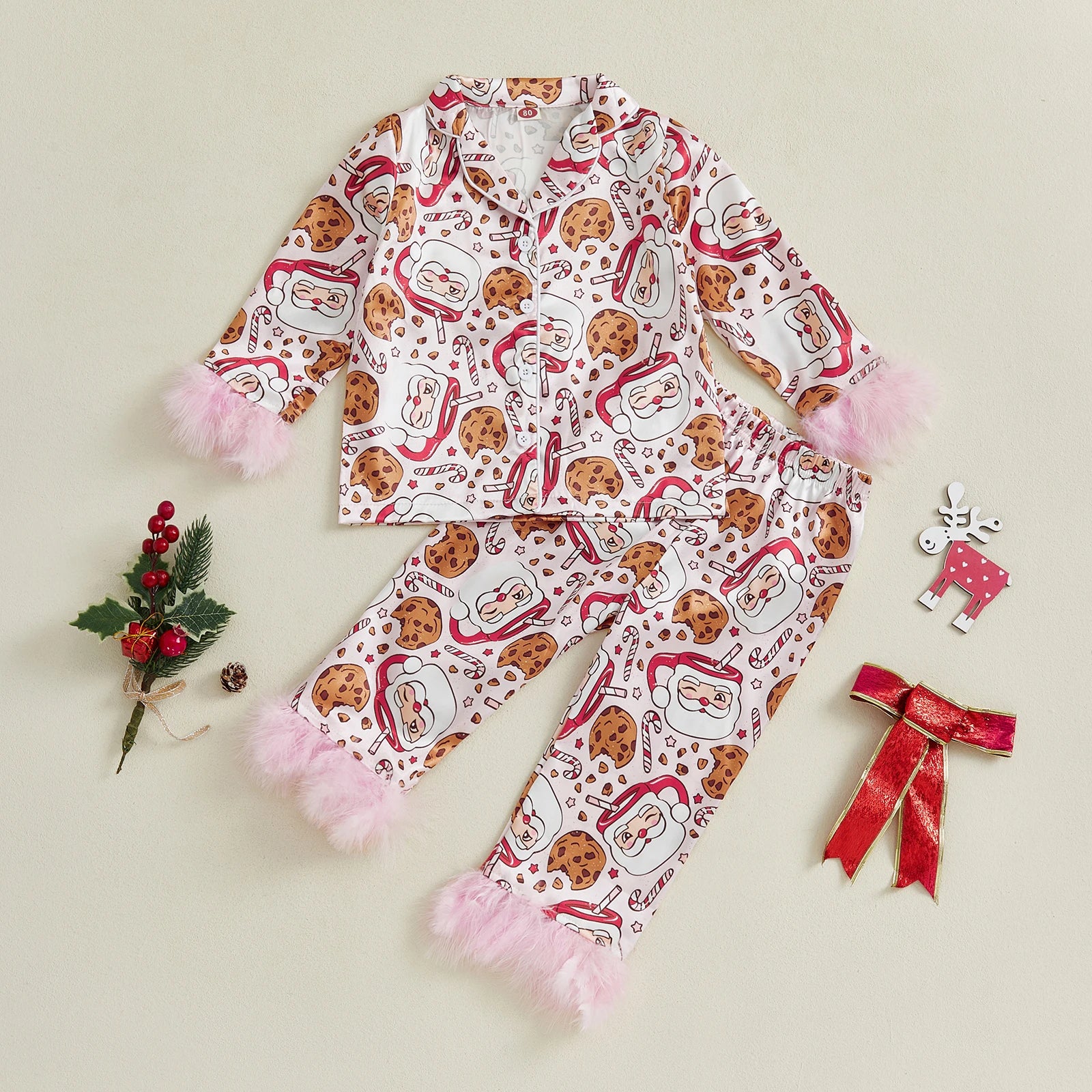 Kid Girl Christmas Pajamas Feather Cuffs Santa Cup and Biscuit Print Long Sleeve Lapel Tops + Pants Set Toddler SleepwearSize (cm)