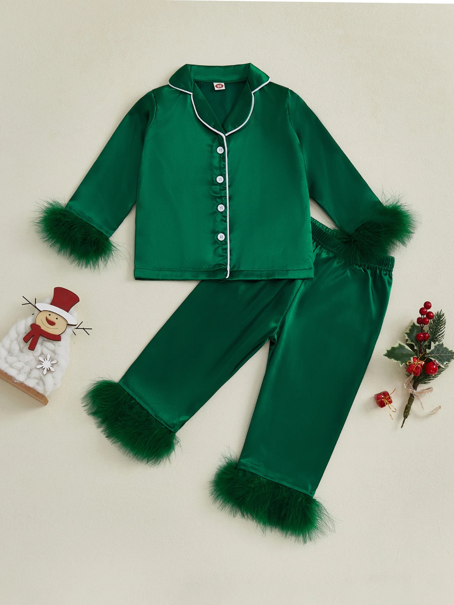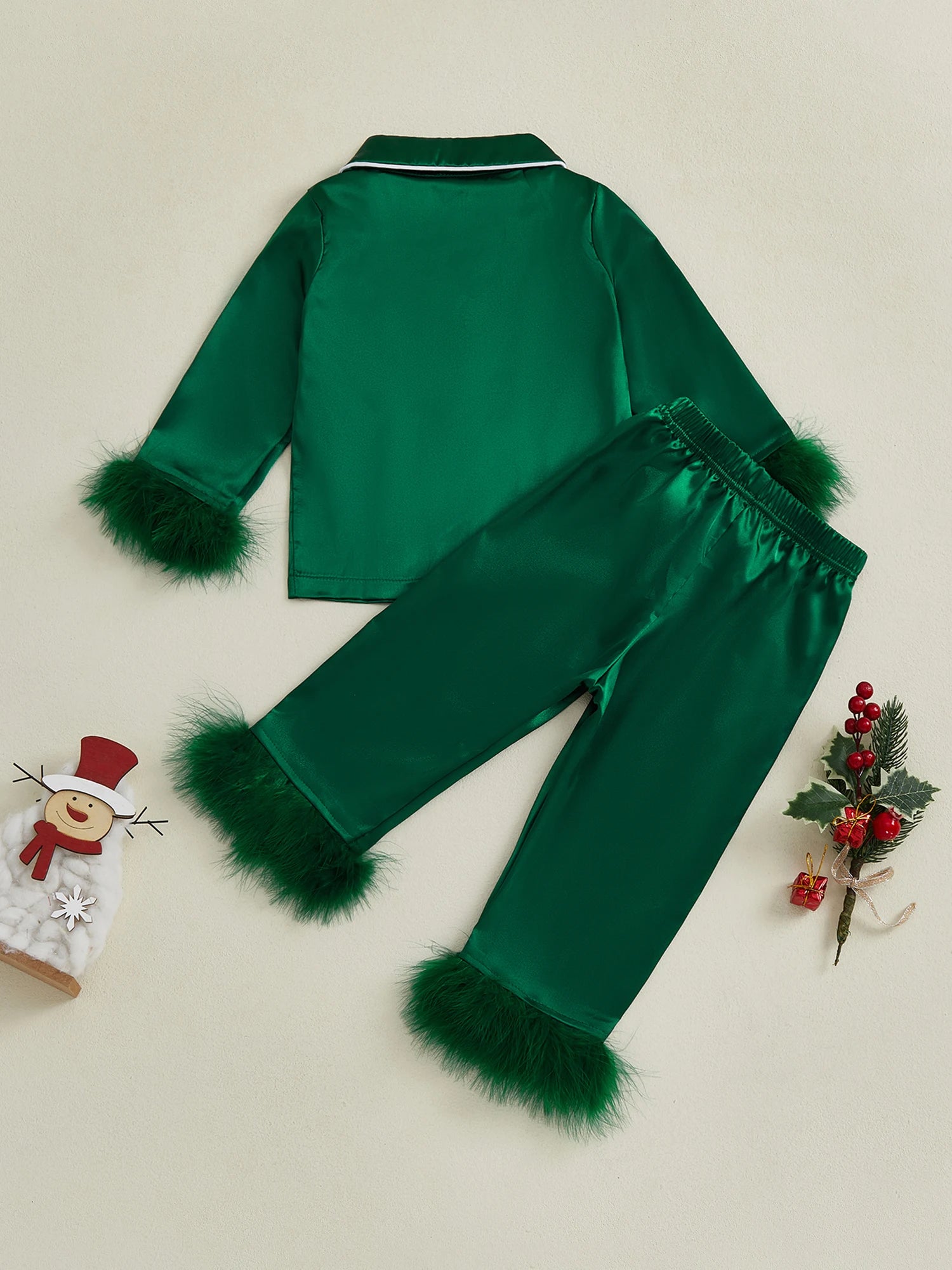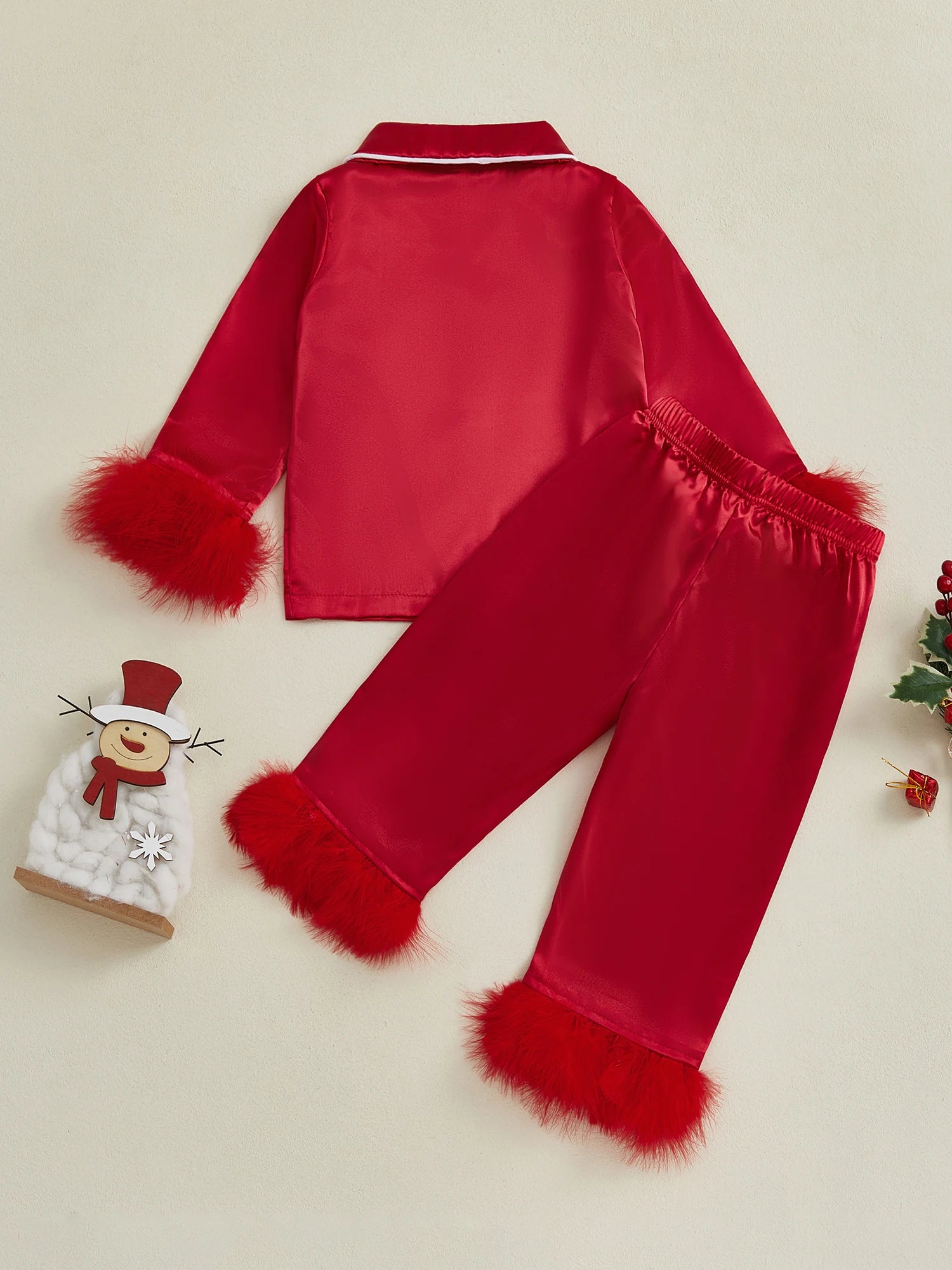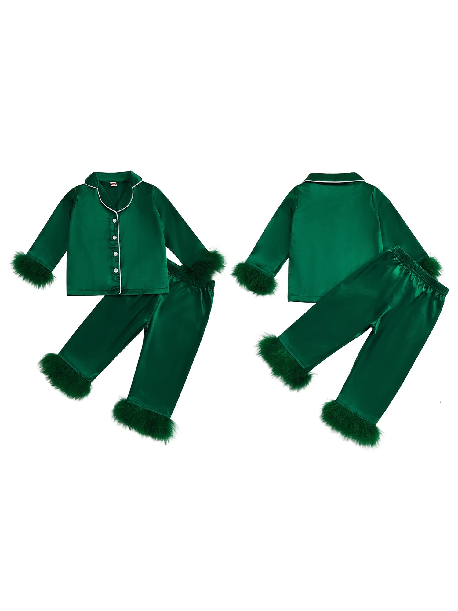 Kids Satin Pajama Set Fuzzy Trim Long Sleeve Button-up Tops Elastic Waist Pants 2 Piece Sleepwear OutfitSize (cm)