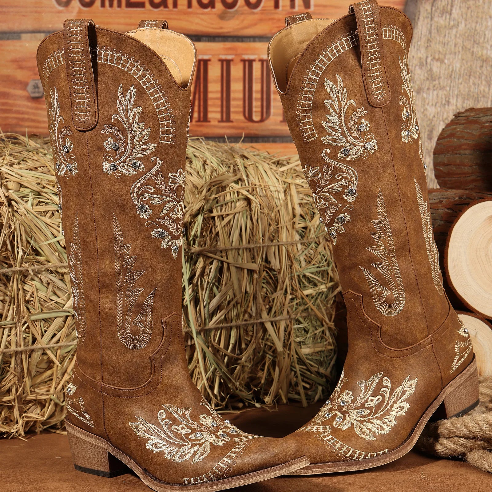 Cowboy Boots for Women - Wide Calf Knee High Western Cowgirl Boots, Sparkly Rhinestone Retro Country Boots Brown