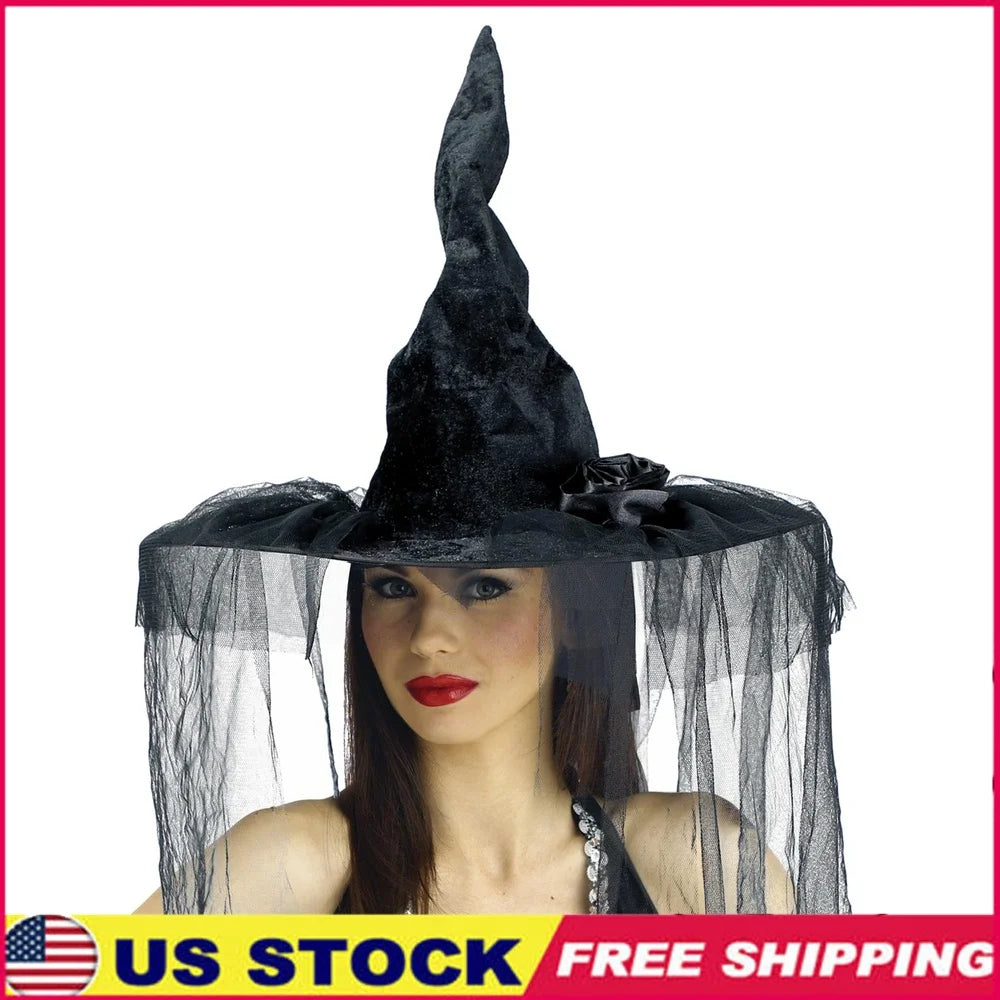 Deluxe Adult Halloween Witch Hat with Adjustable Band Chiffon Veils Beads Elegant Design One Size Fits Most