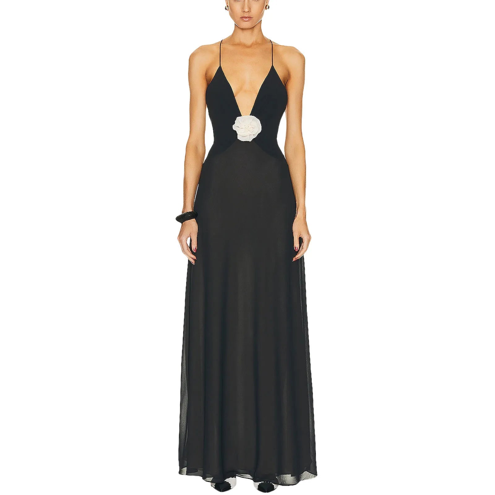 Elegant Women s Sleeveless V Neck Maxi Dress with Floral Embellishments for Summer Evening Parties and Events