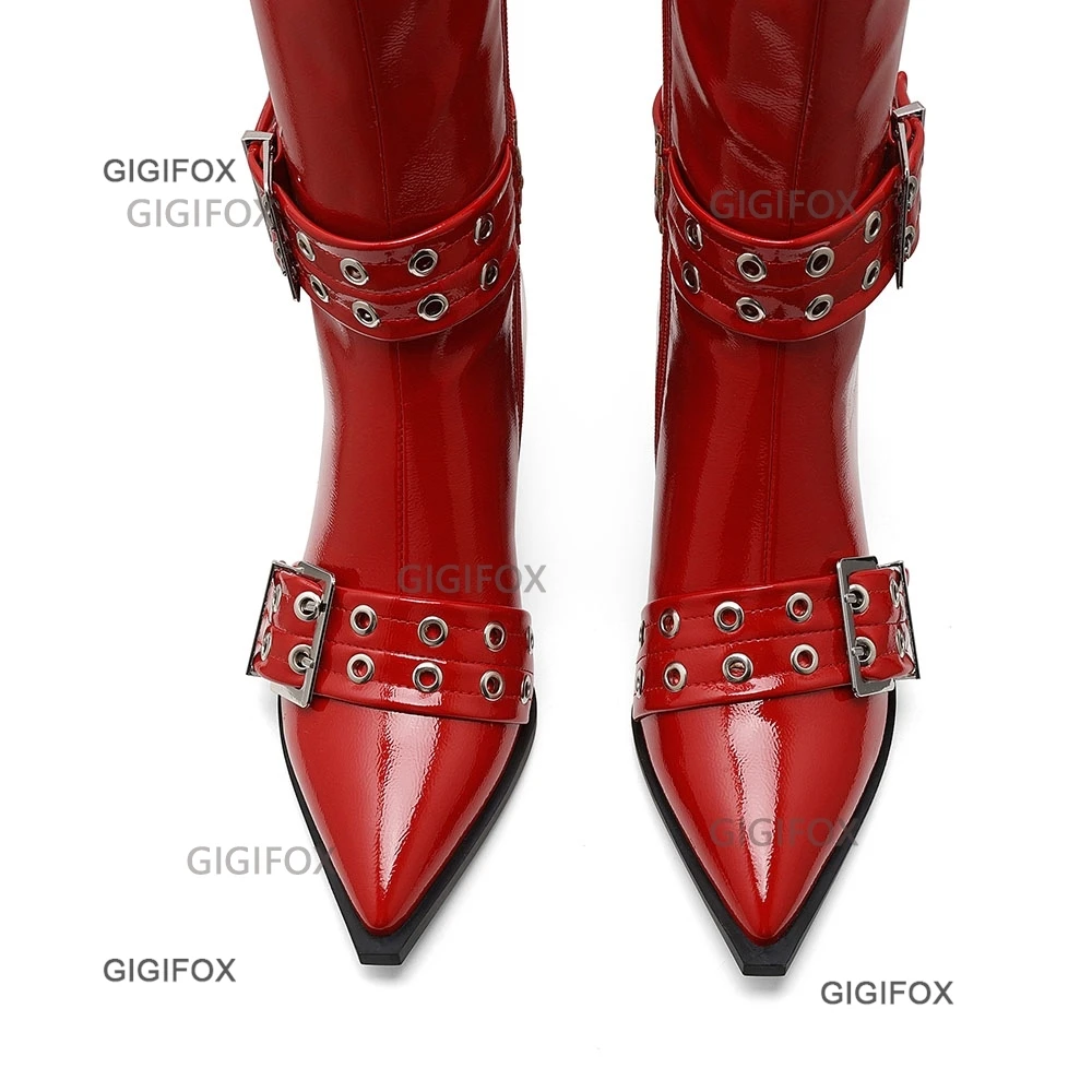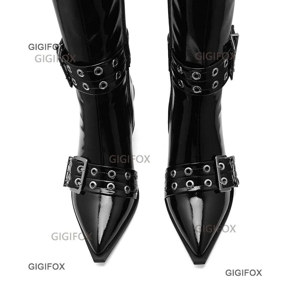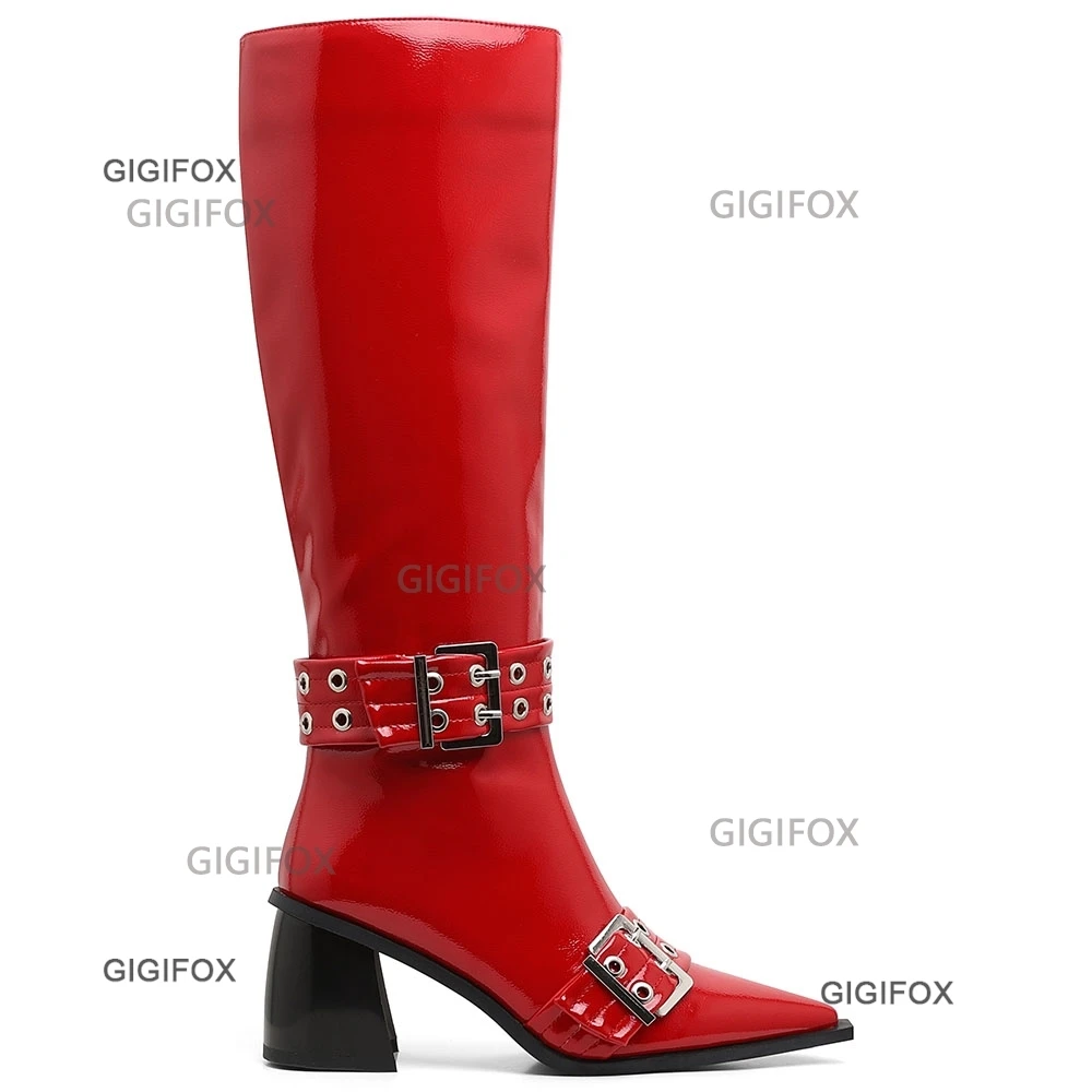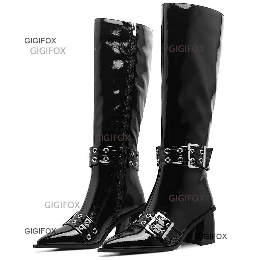 GIGIFOX Pointed Toe Women Zipper Knee-high Boots Chunky High Heel Patent Leather Metal Buckle Shoes Punk Fashion Boots For Woman