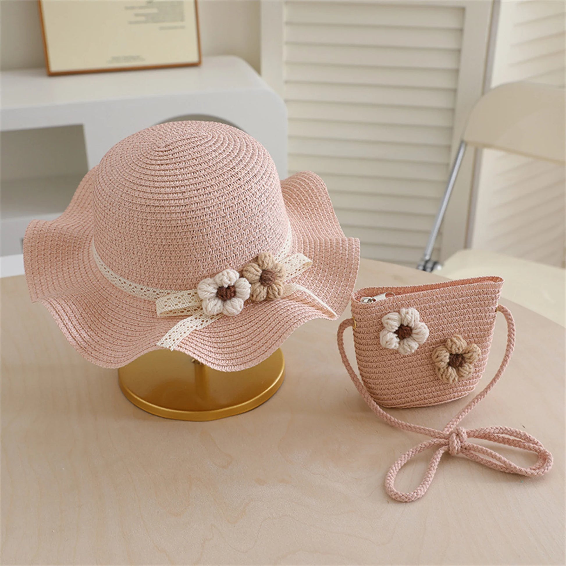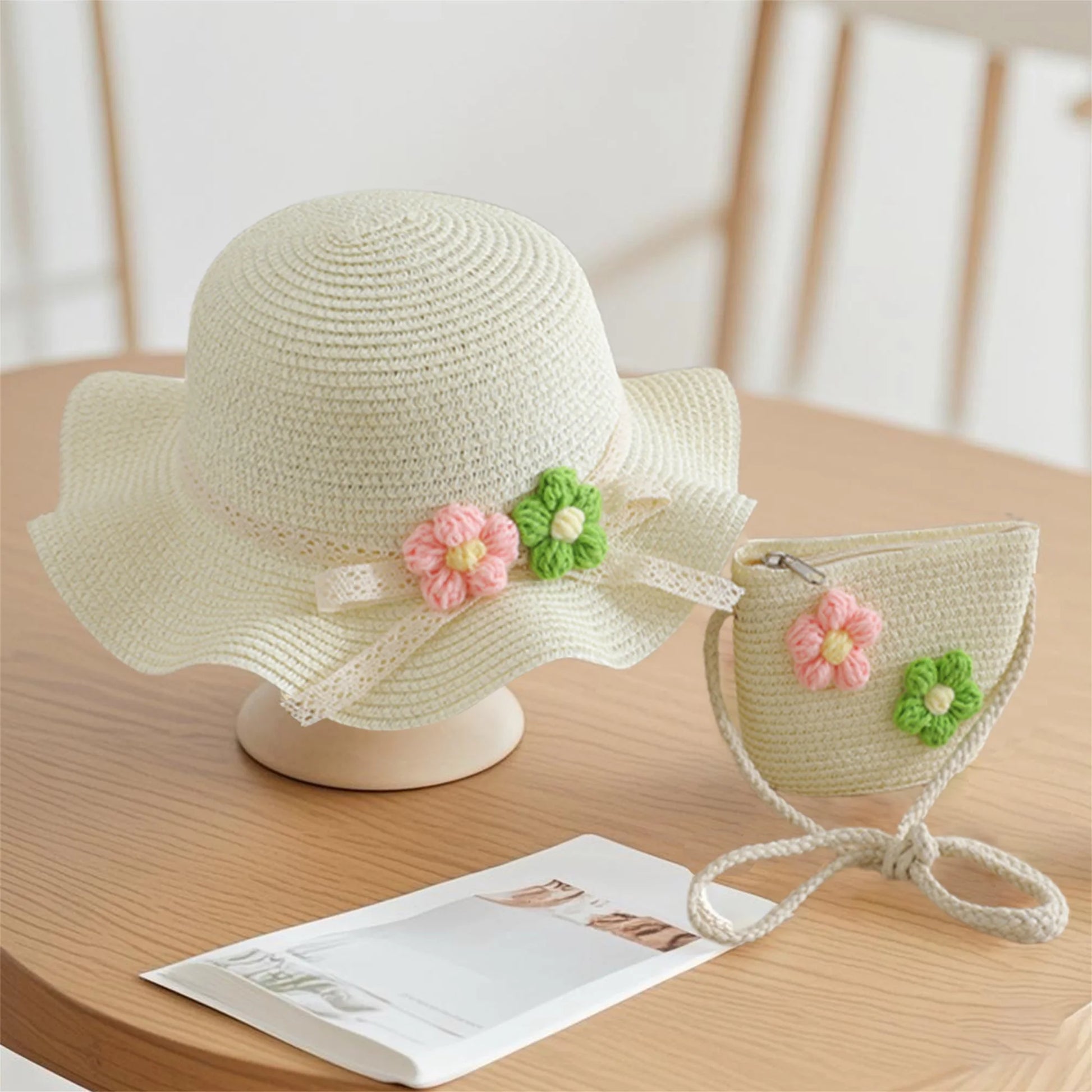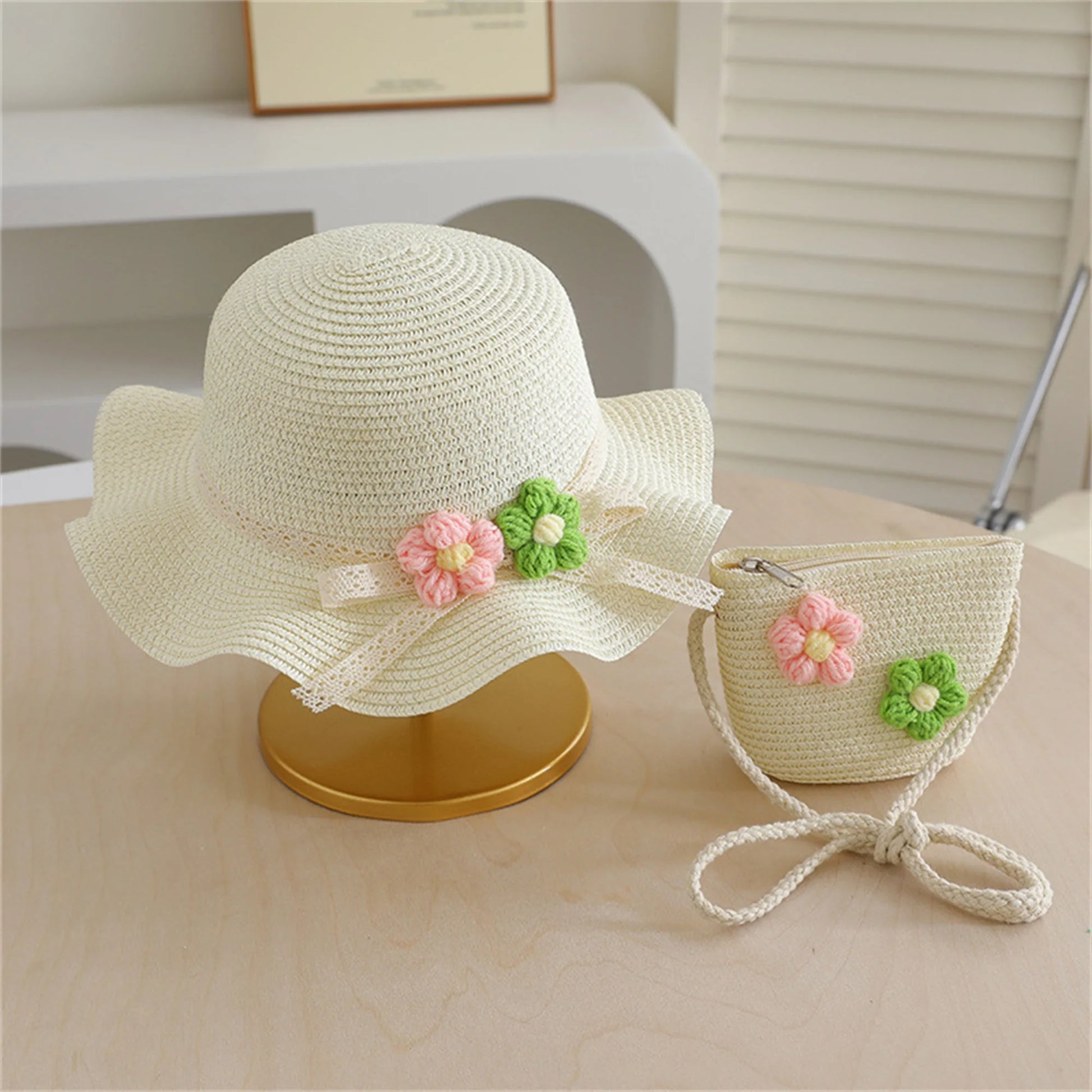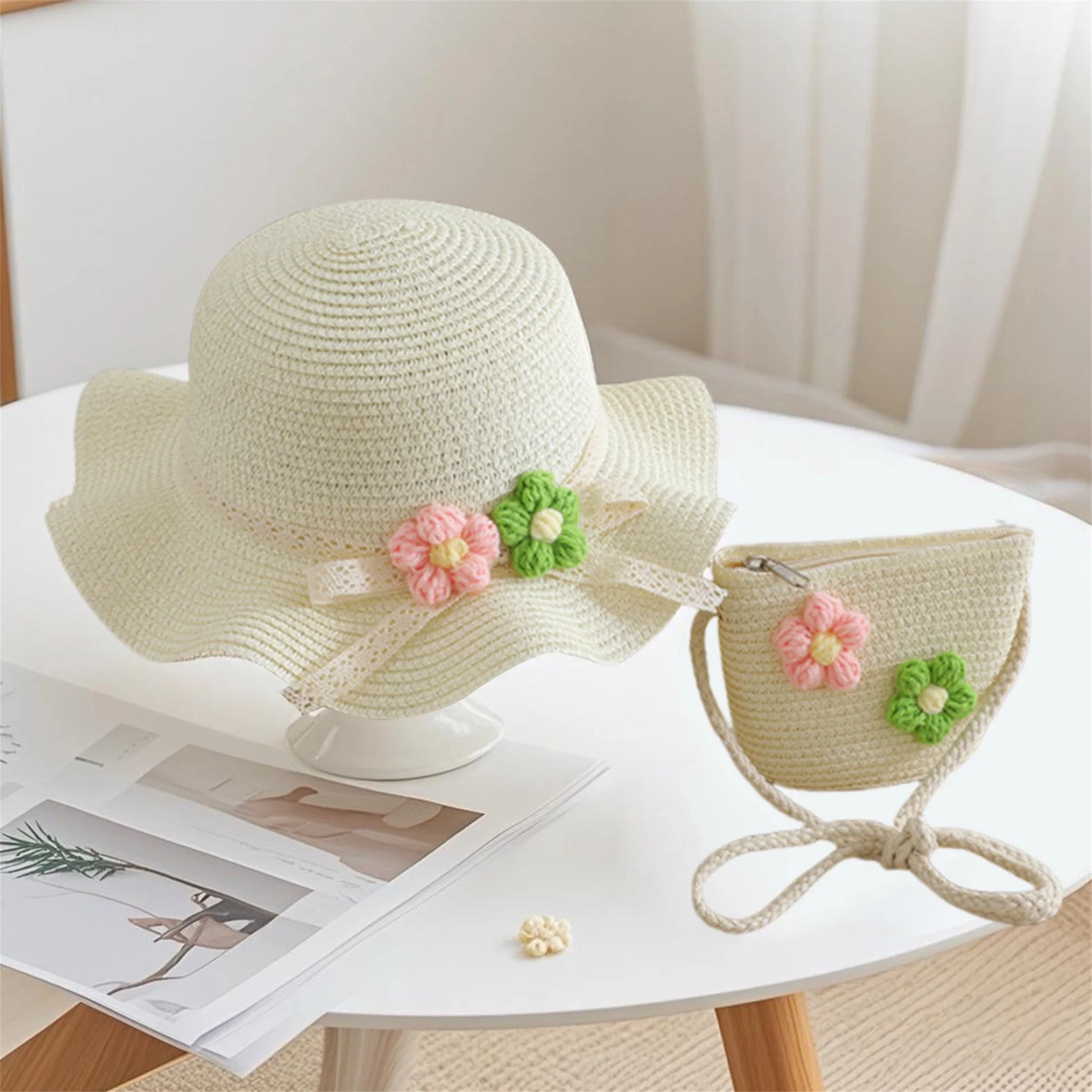 Summer Straw Hat and Bag Set for Girls 3D Flower Lace Bow Wide Brim Fisherman Cap and Crossbody BagSpecification: