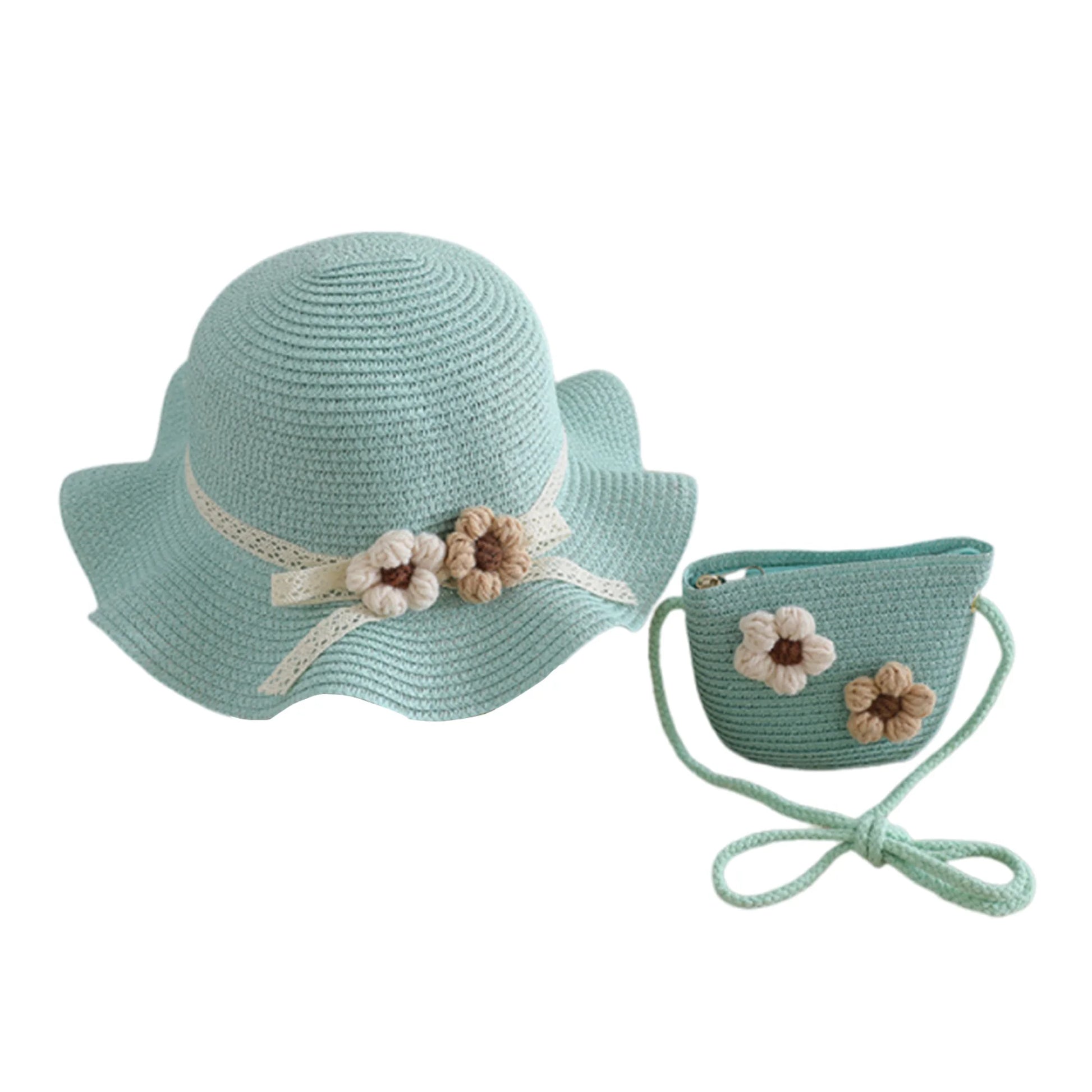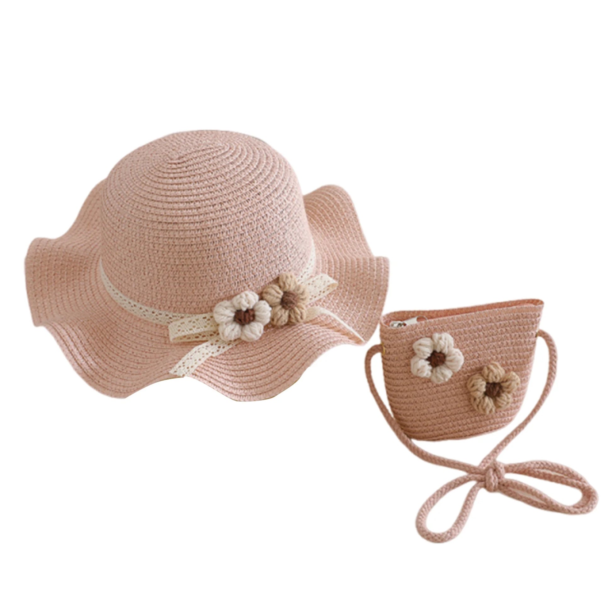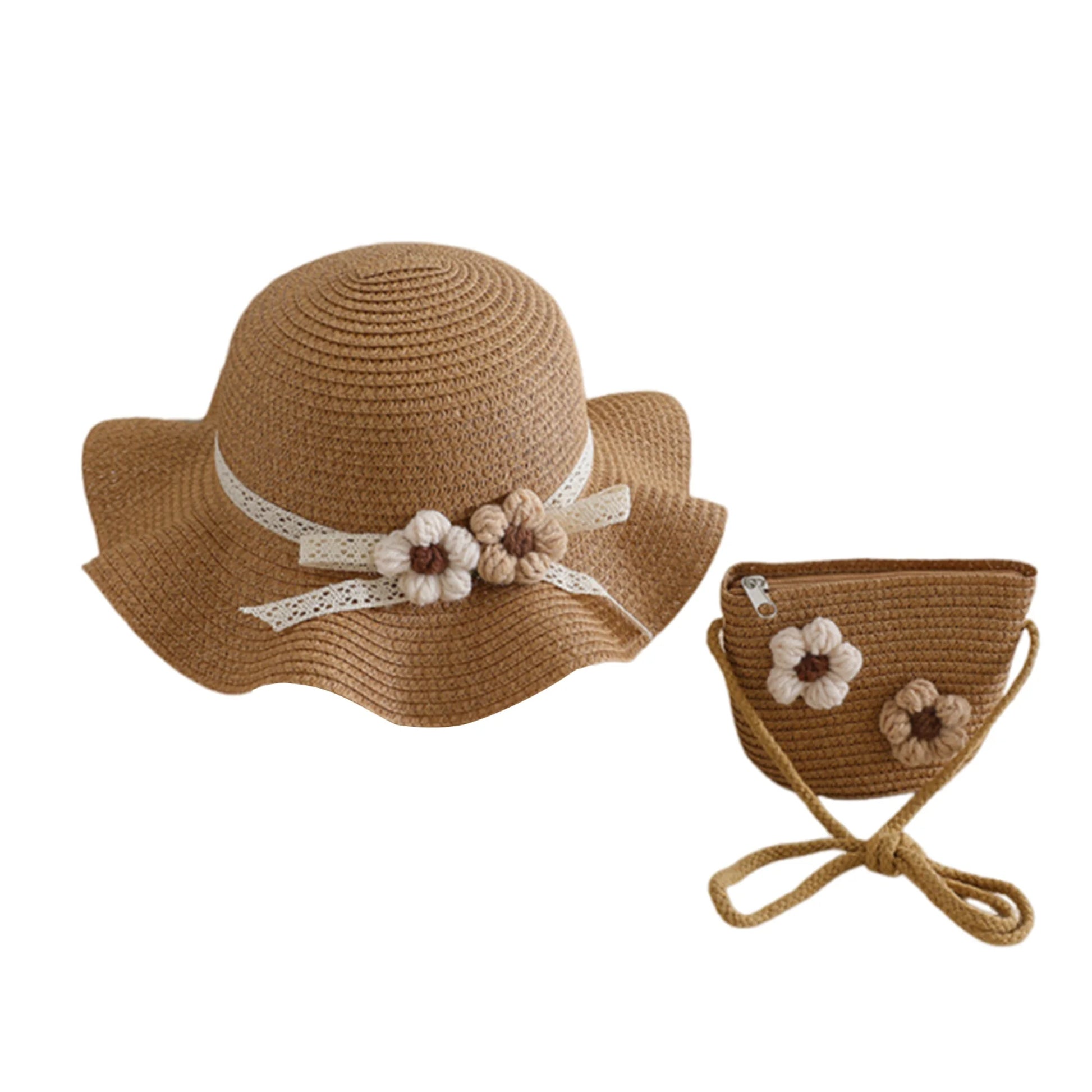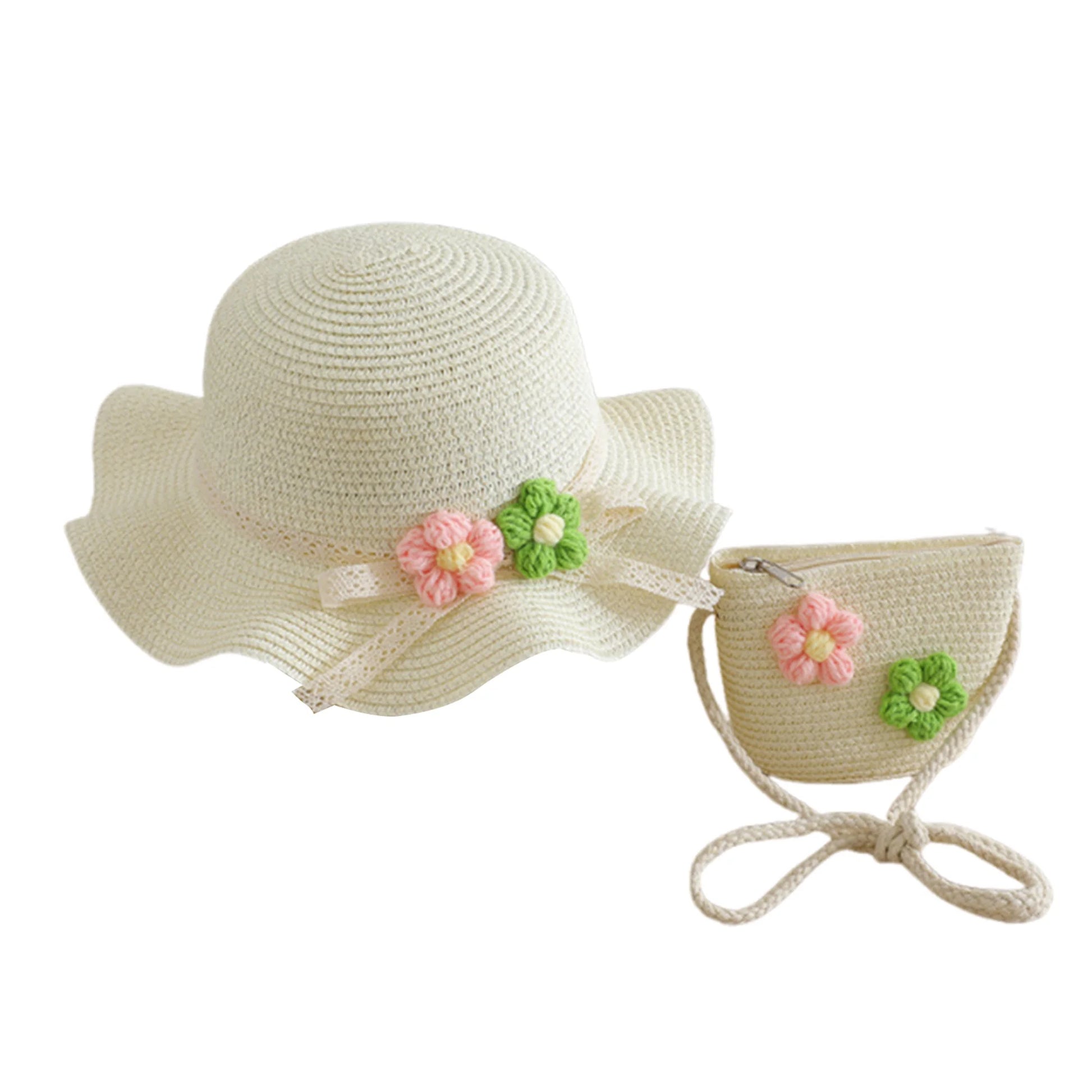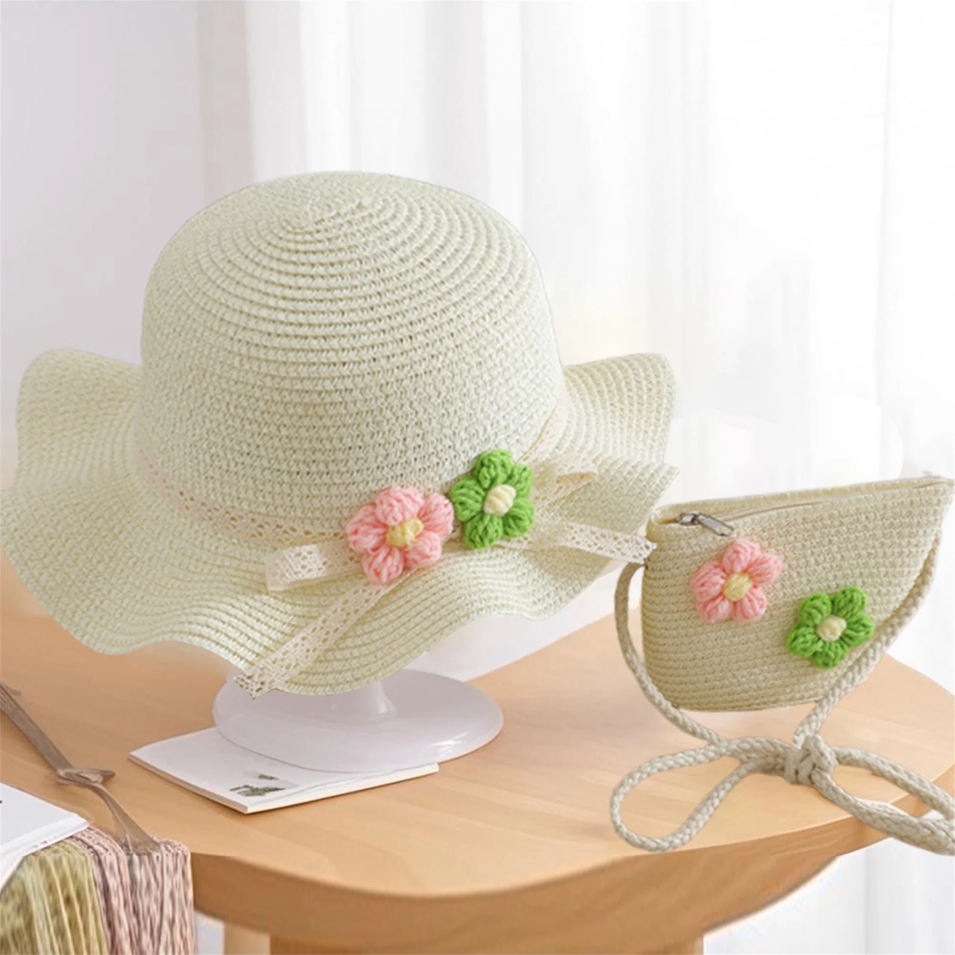 Summer Straw Hat and Bag Set for Girls 3D Flower Lace Bow Wide Brim Fisherman Cap and Crossbody BagSpecification: