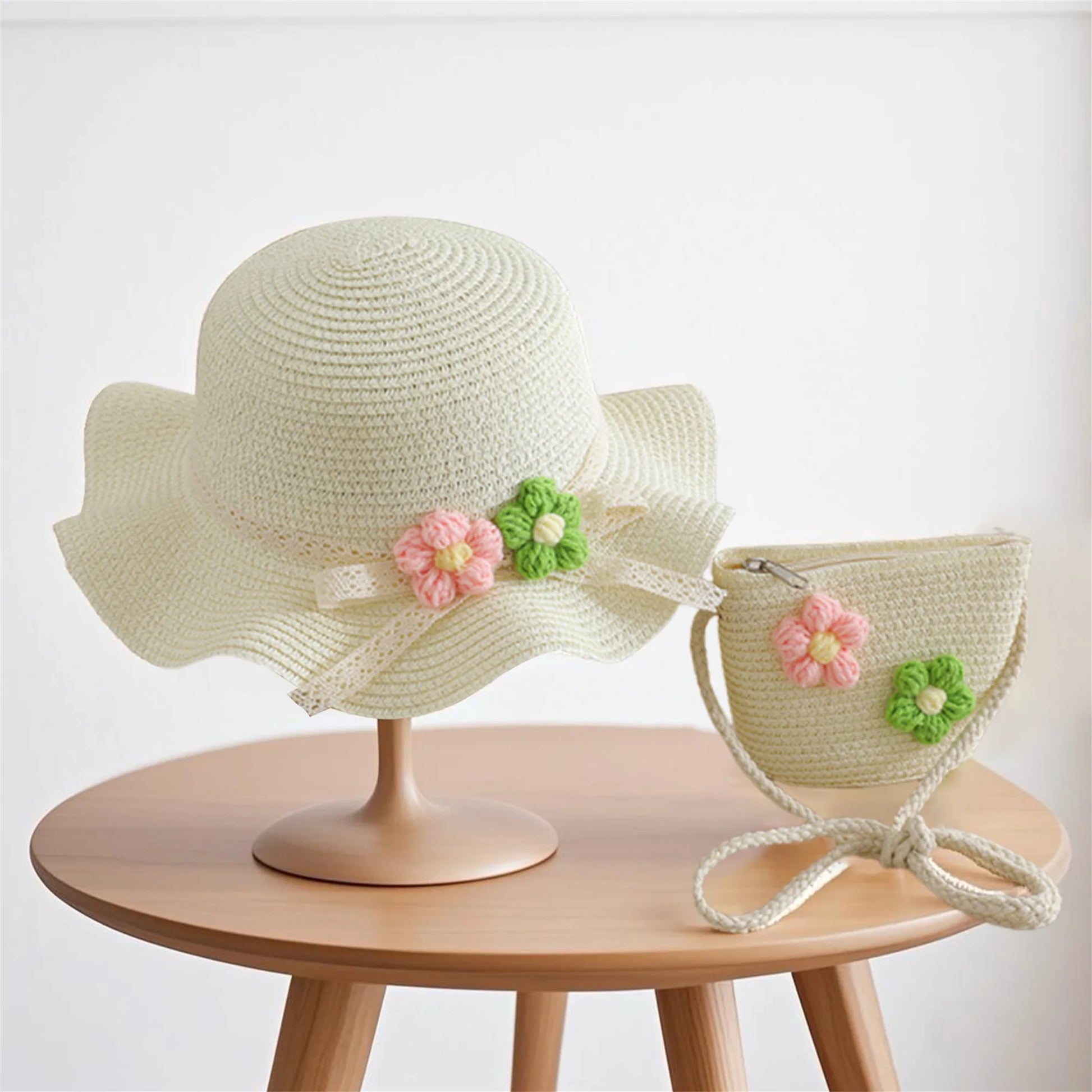 Girls Summer Sun Hat and Tote Bag Set with 3D Floral Embellishments Lace Detail Wide Brim and Adjustable Crossbody Strap