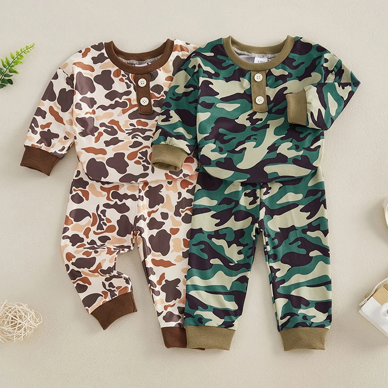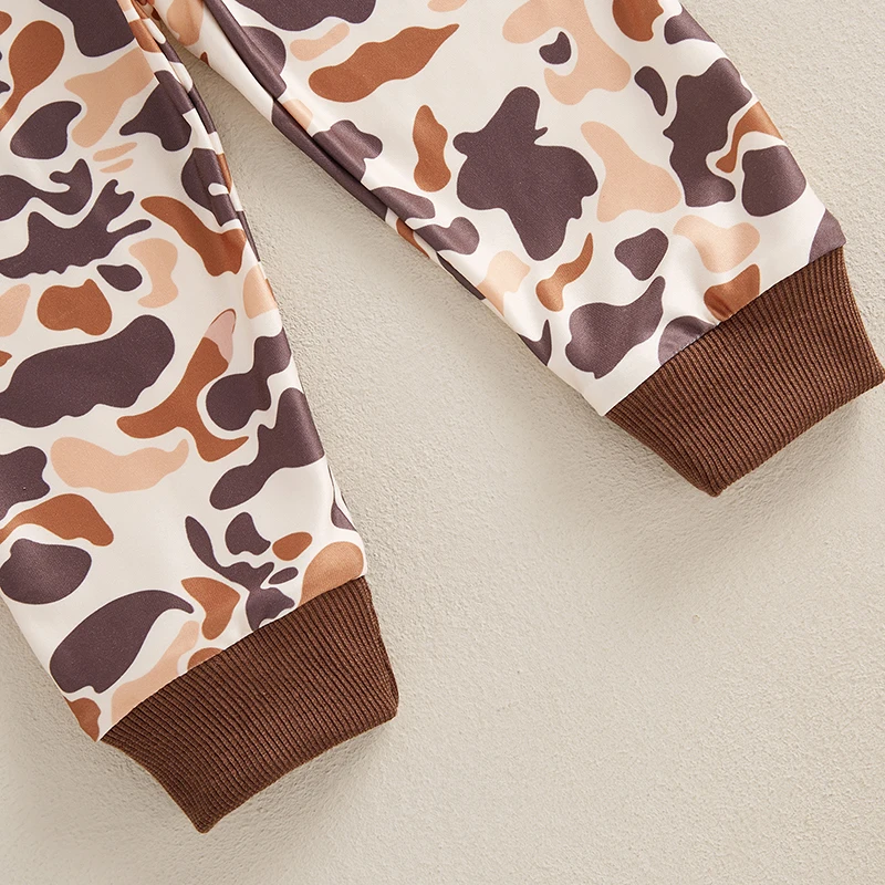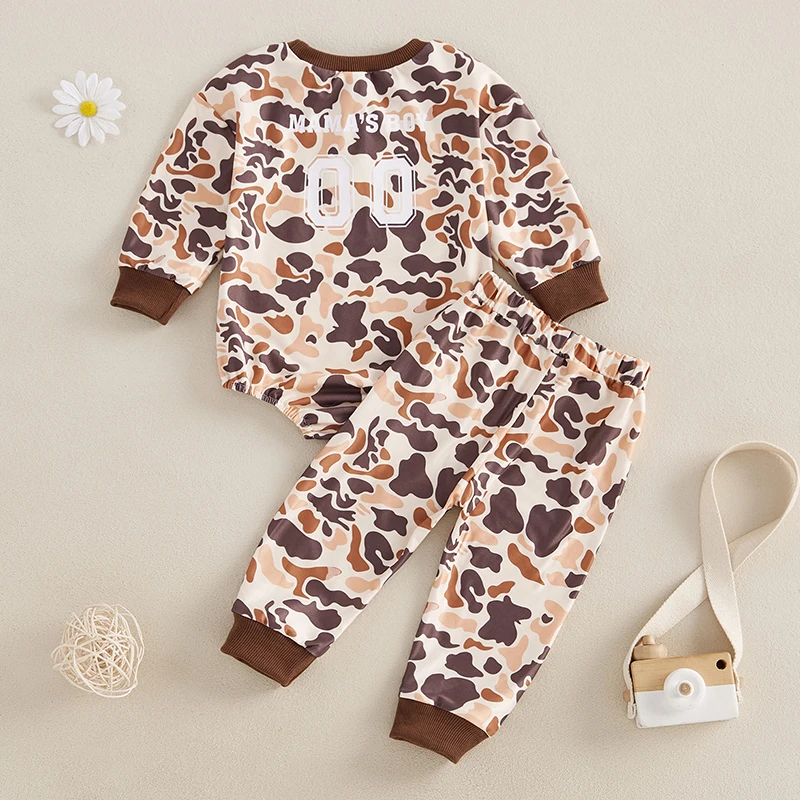 Infant Boys Fall Outfits Camouflage Letter Pattern Long Sleeve Crew Neck Rompers with Elastic Waist Pants 2 Pcs Set
