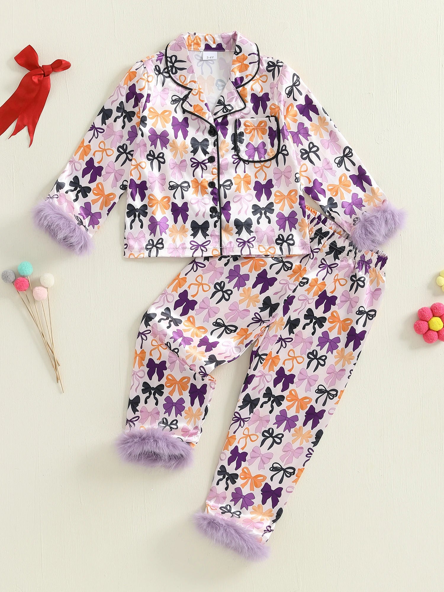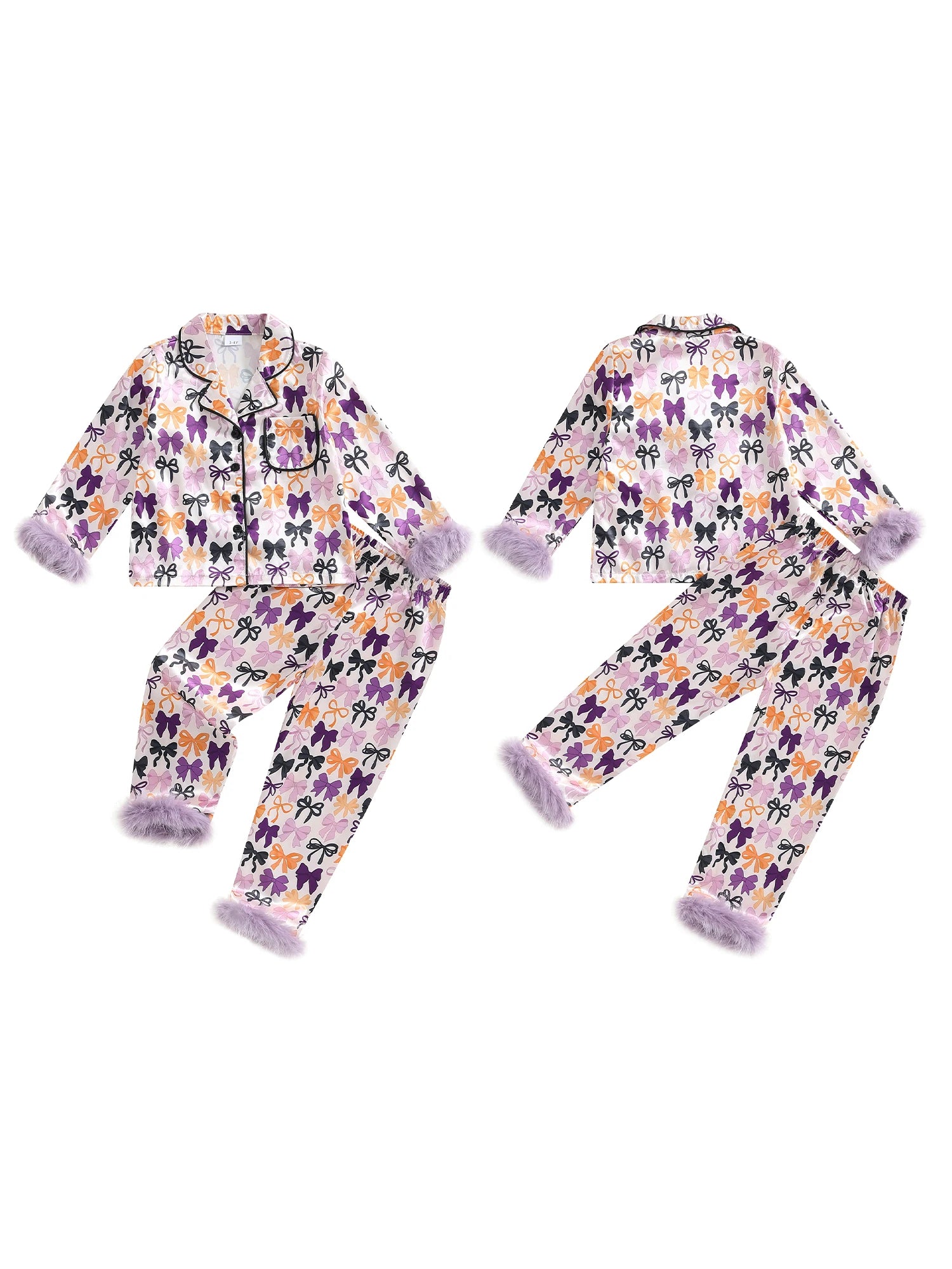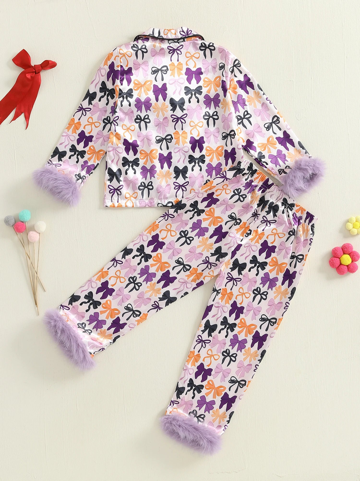 Kids Halloween Satin Pajama Set with Bow Print Long Sleeve Lapel V Neck Top and Pants Sleepwear for Toddlers