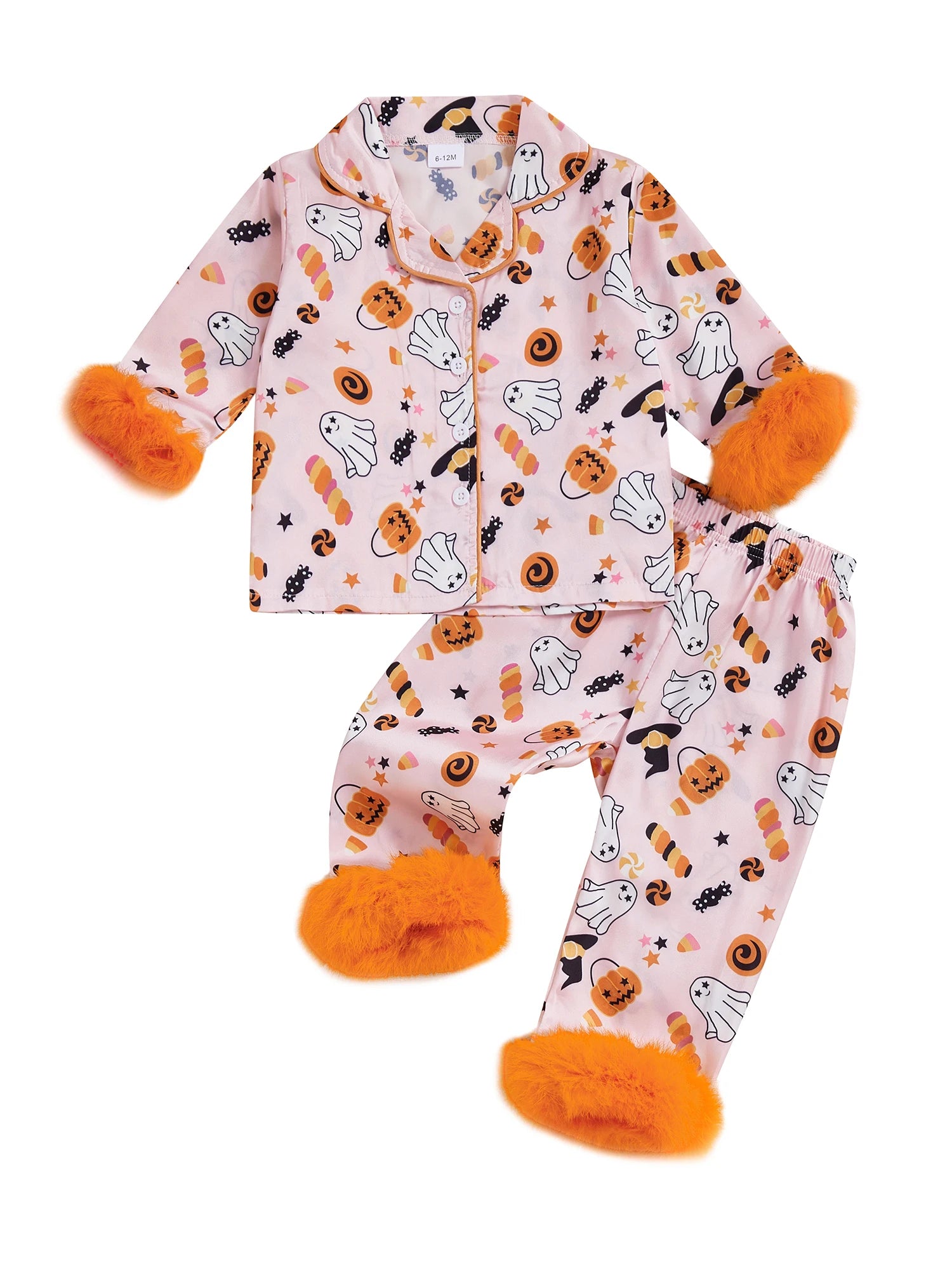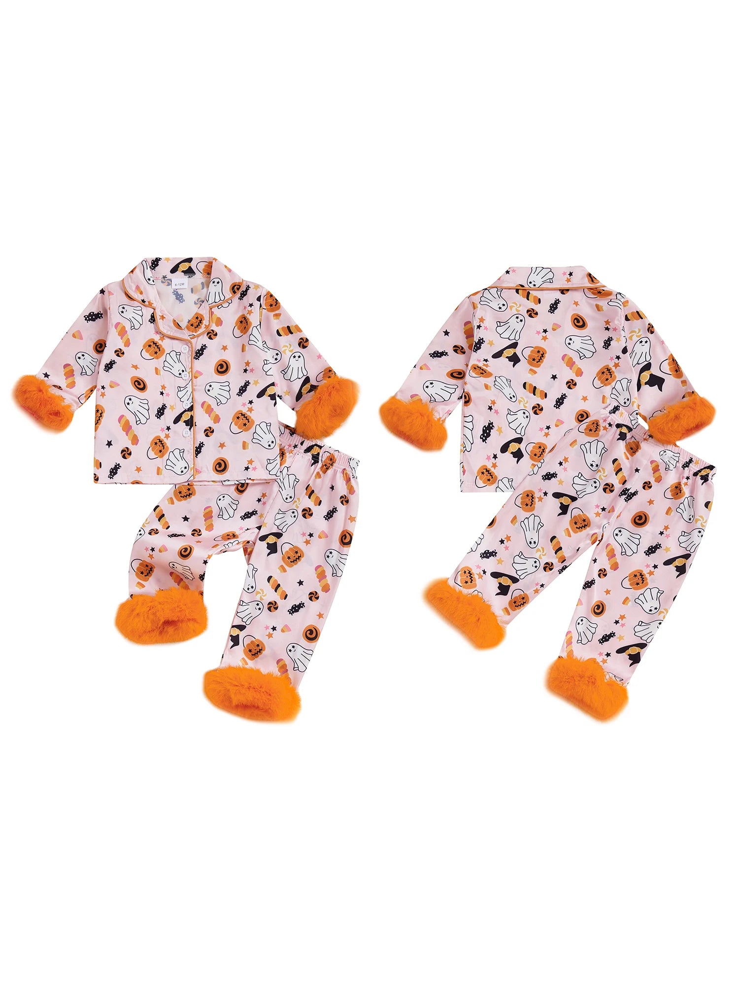 Toddler Girl Halloween Satin Pajamas Set Ghost Print Lapel Long Sleeve Button Down Tops with Pants SleepwearSize(cm)