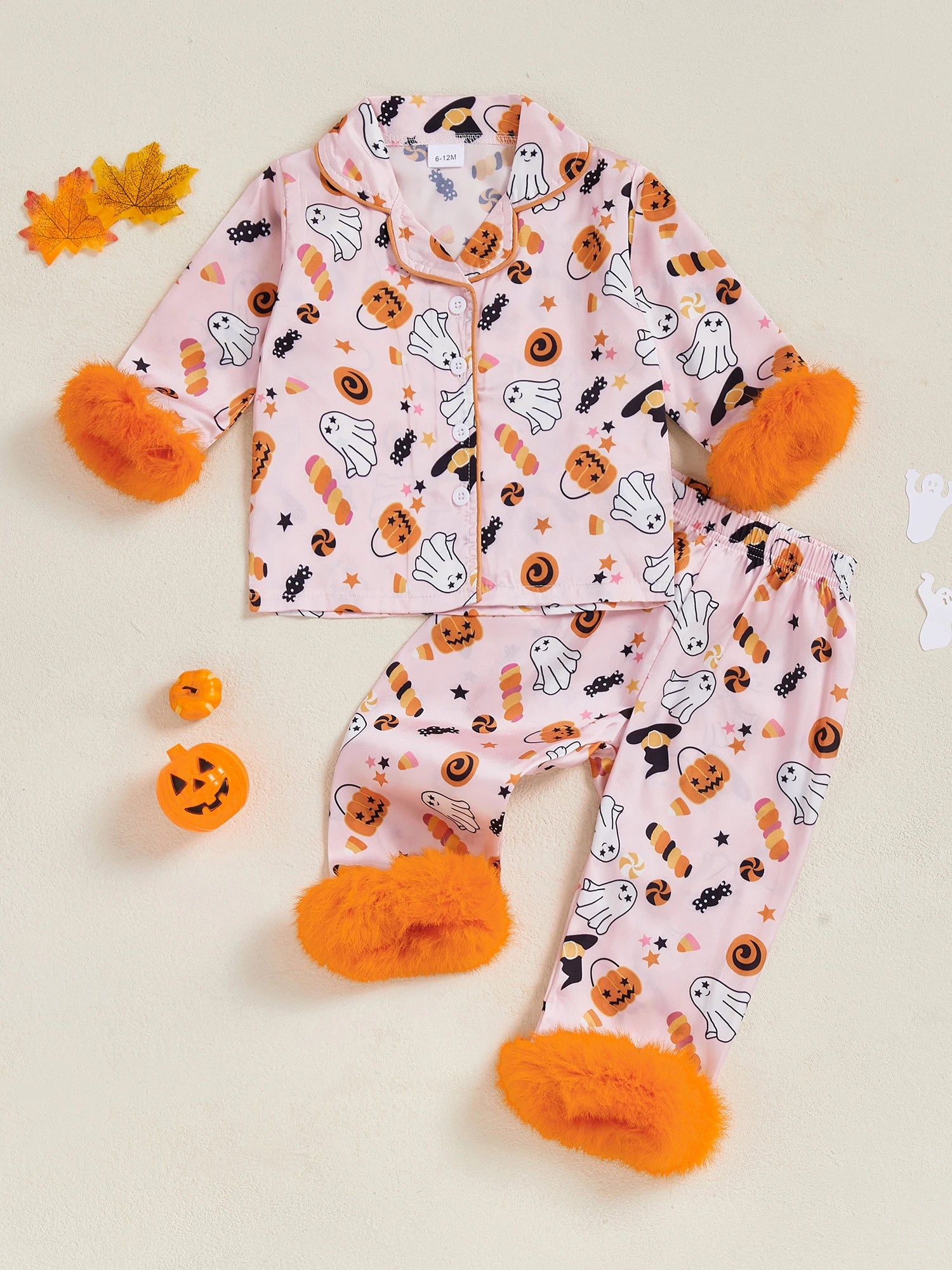 Kids Halloween Satin Pajamas Set Witch Print Lapel Long Sleeve Button Down Tops with Pants Sleepwear for Little Girls