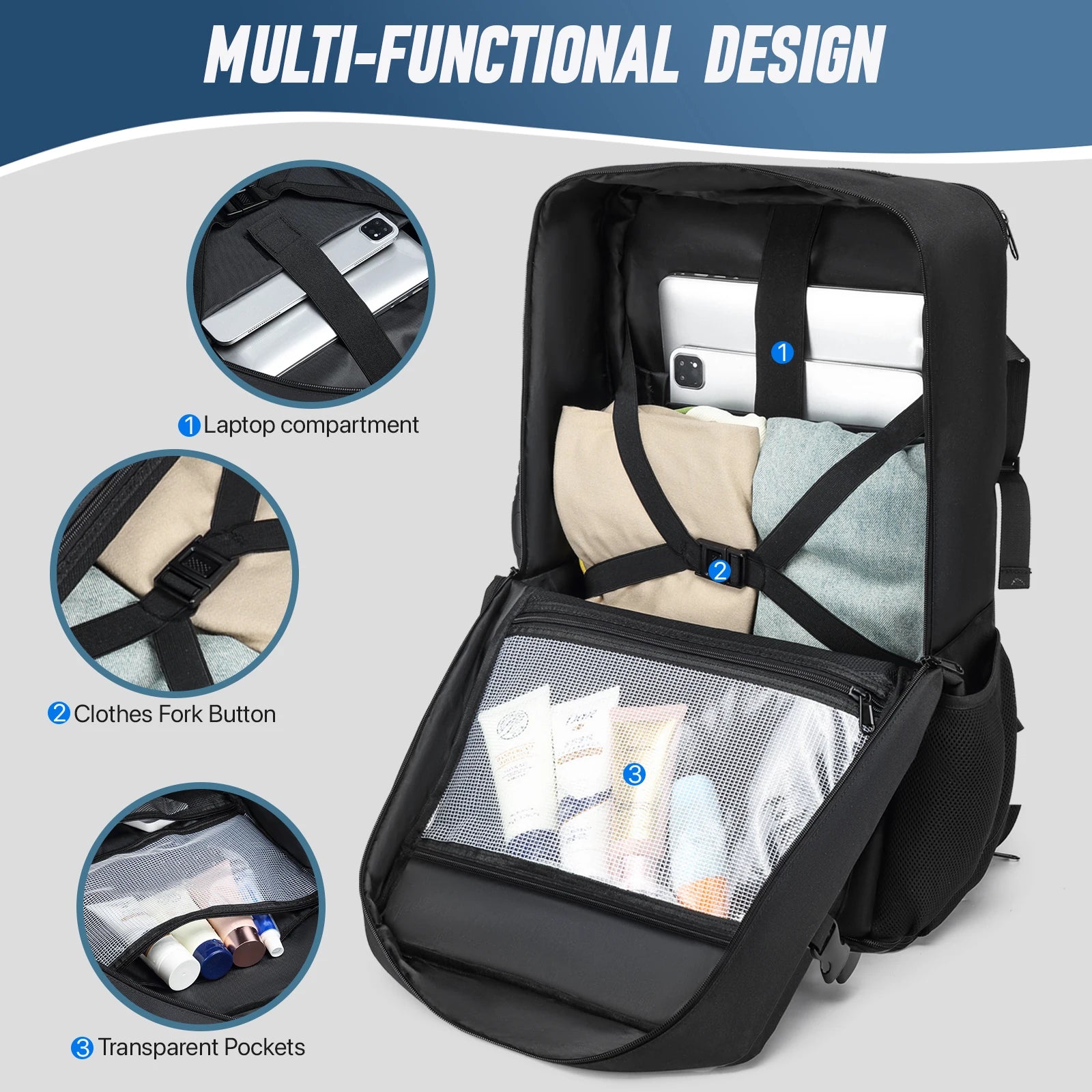 3.Shoe Storage :The backpack comes with a dedicated compartment for shoes, keeping them clean and dry while you're on the move.
