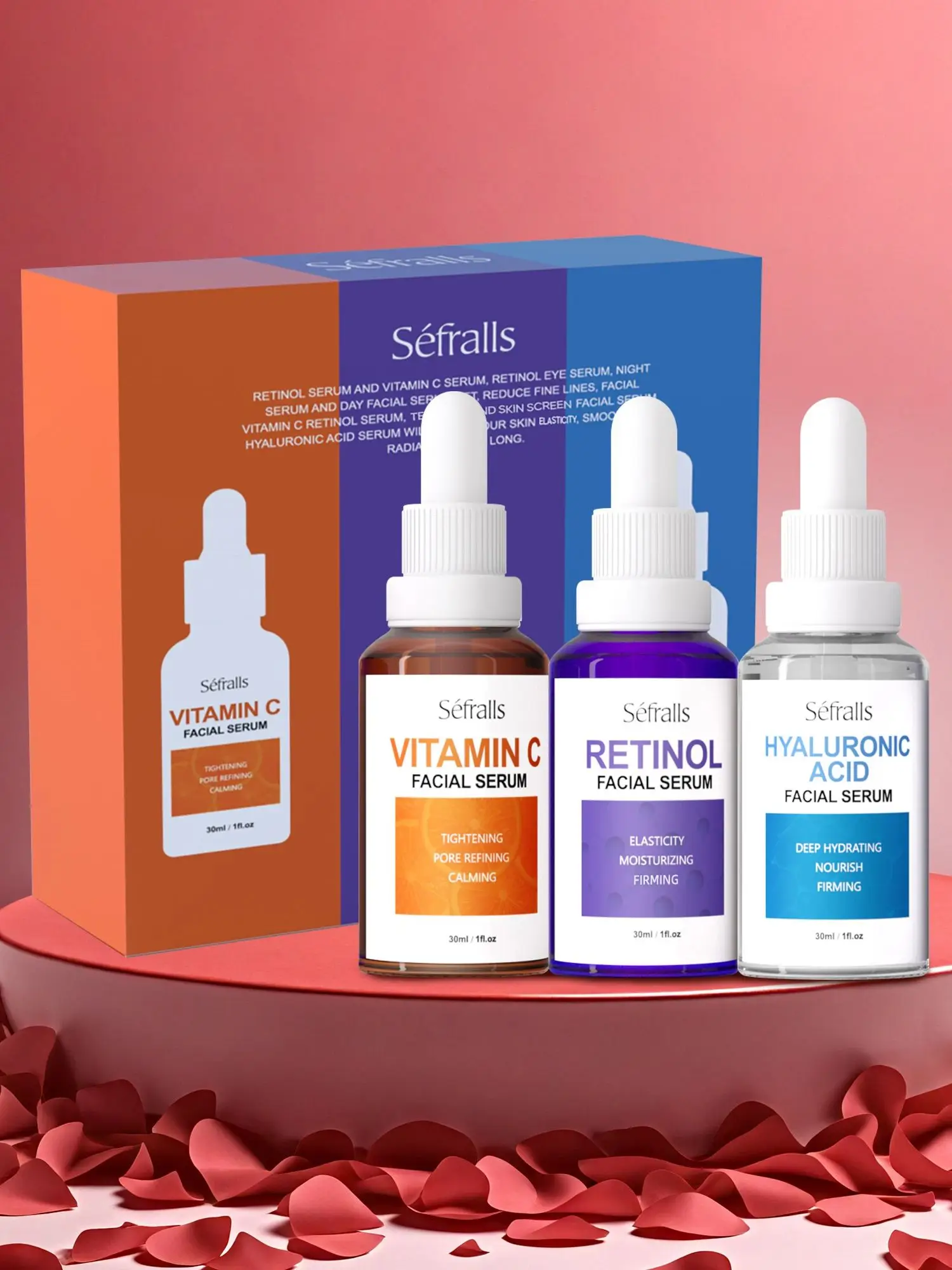 Séfralls Hyaluronic Acid VC Serum with Vitamin C and A. It offers firming effect, hydrates, whitens, shrinks pores, is anti