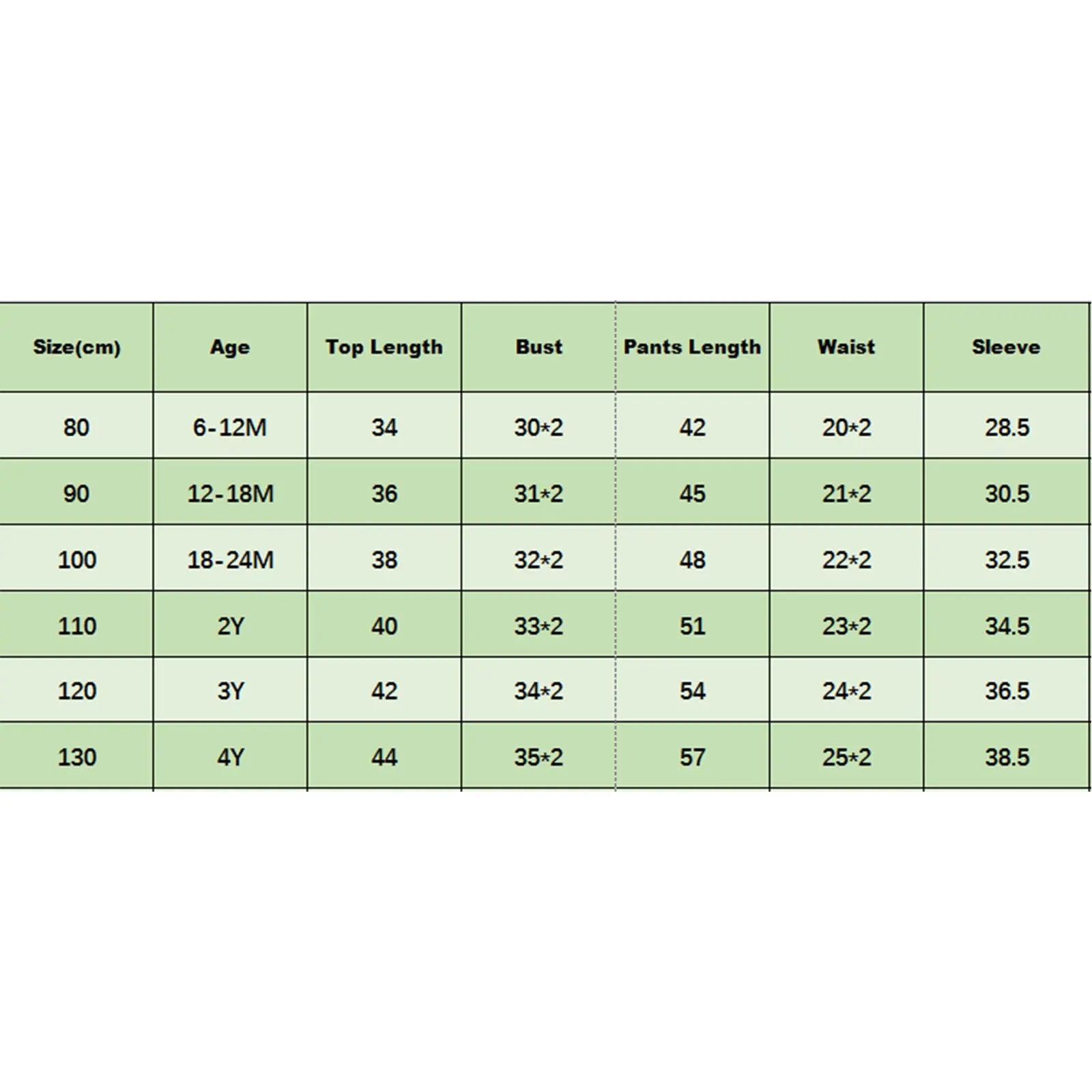 110 Tops Length: 15.75 Bust: 25.98 Sleeve: 13.6 Pants Length: 20.08 Waist: 18.11 Advised Age: 2 Years