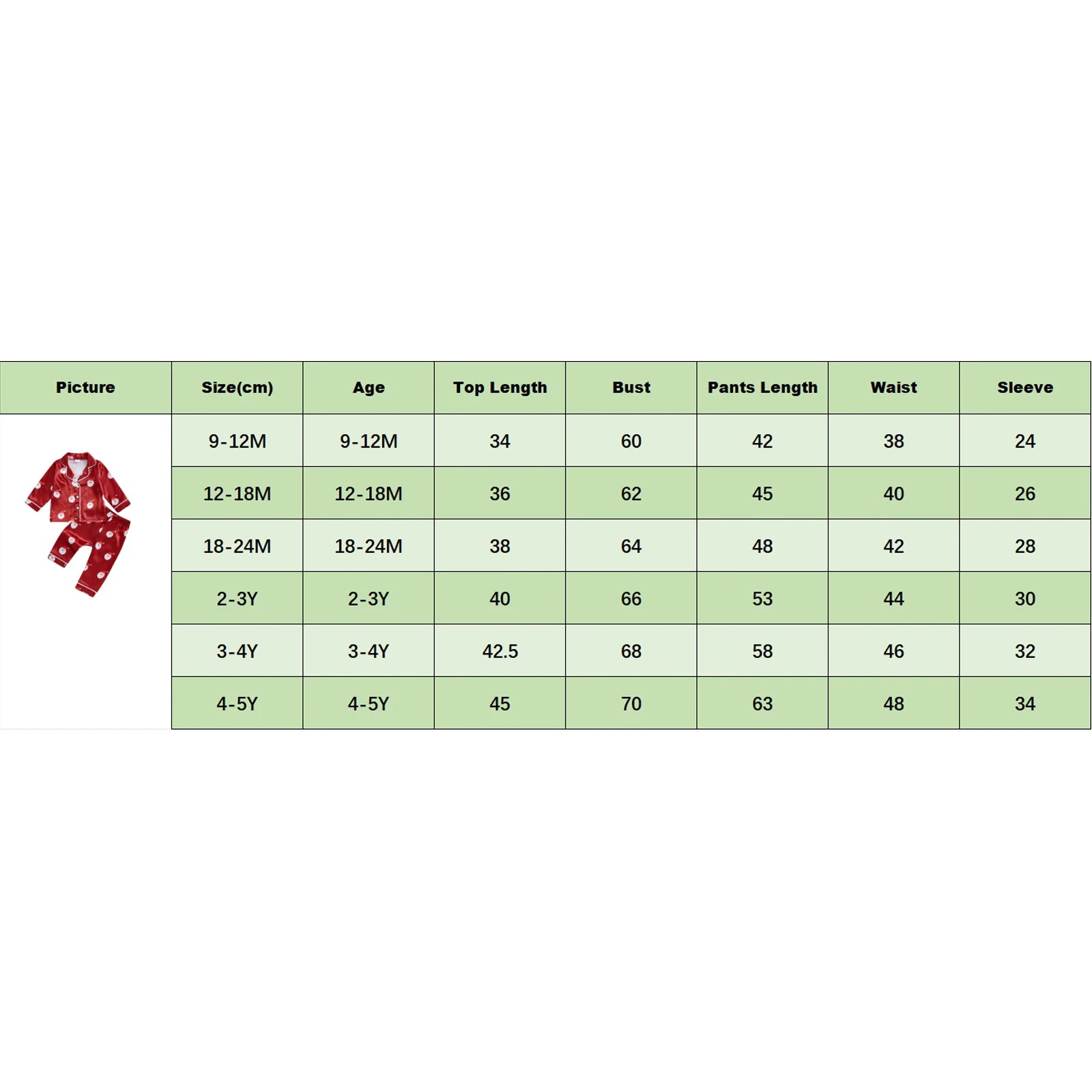 9-12M Tops Length: 34 Bust: 60 Pants Length: 42 Waist: 38 Advised Age: 9-12 Months