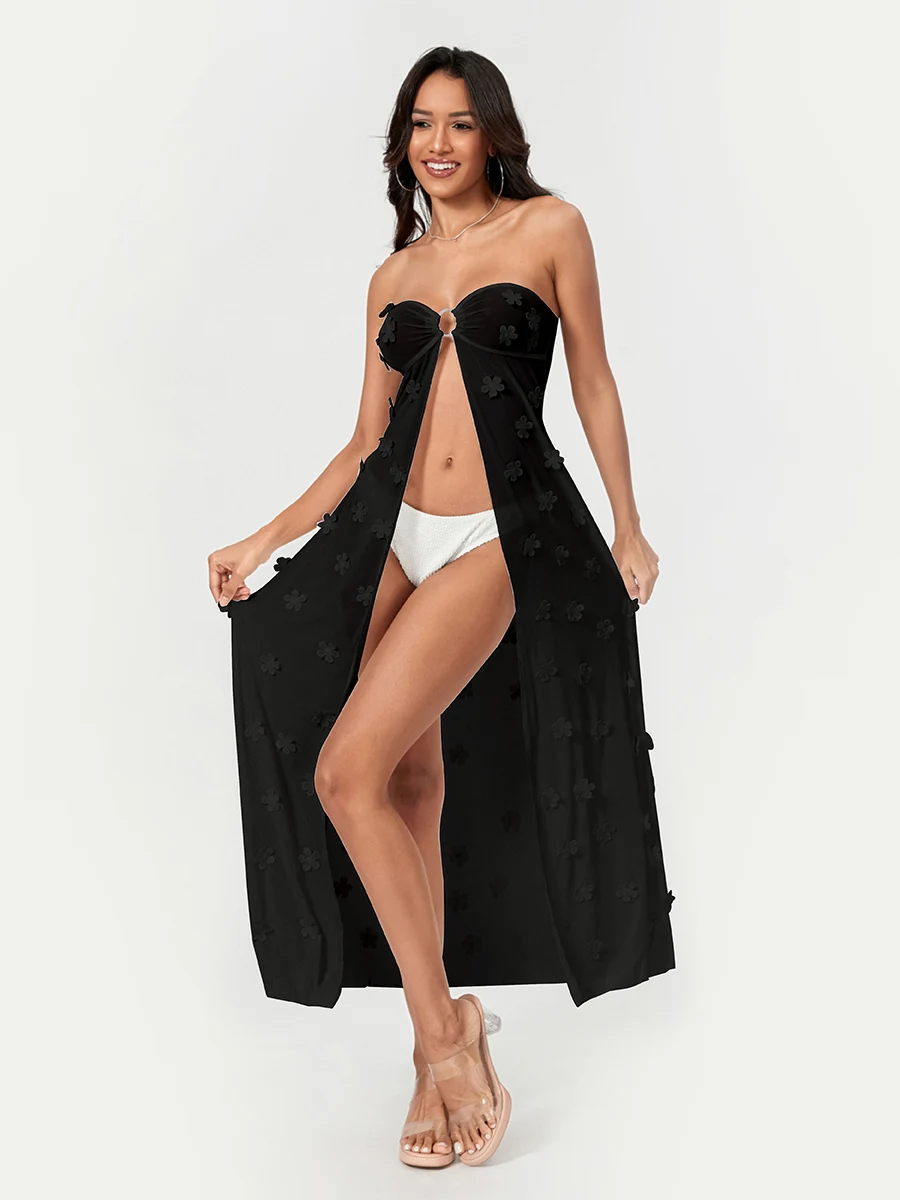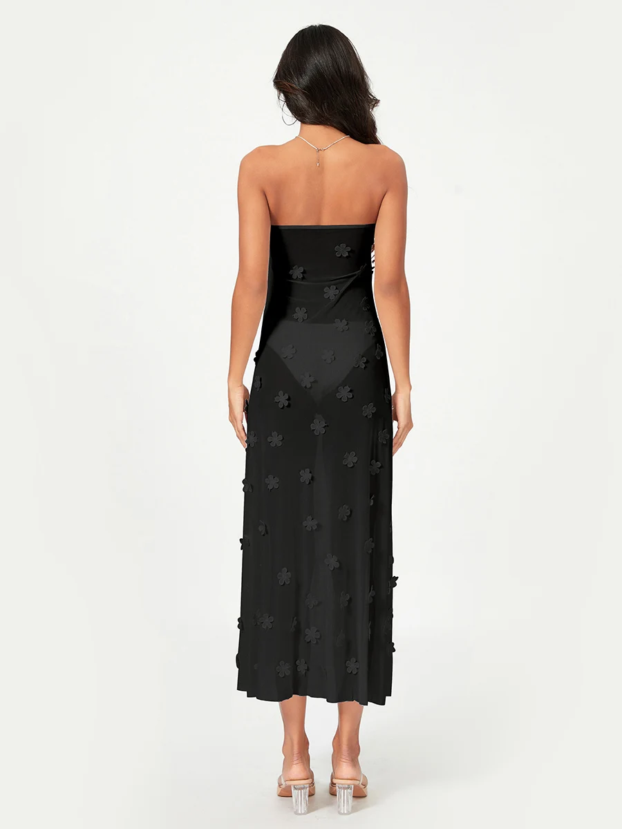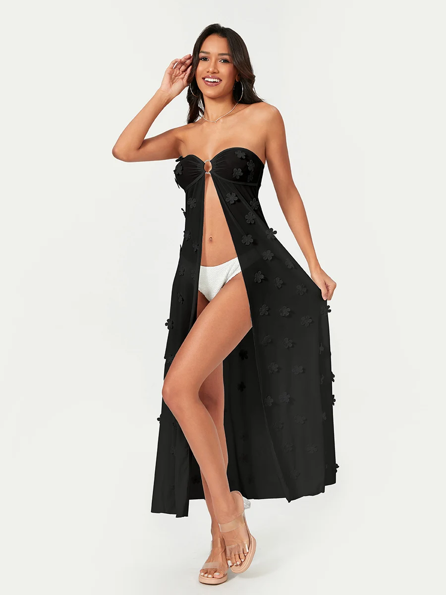 Women Beach Cover Up Flower Embellished See-Through Strapless Summer Swimsuit Coverup Bathing Suit Cover Ups Dresses