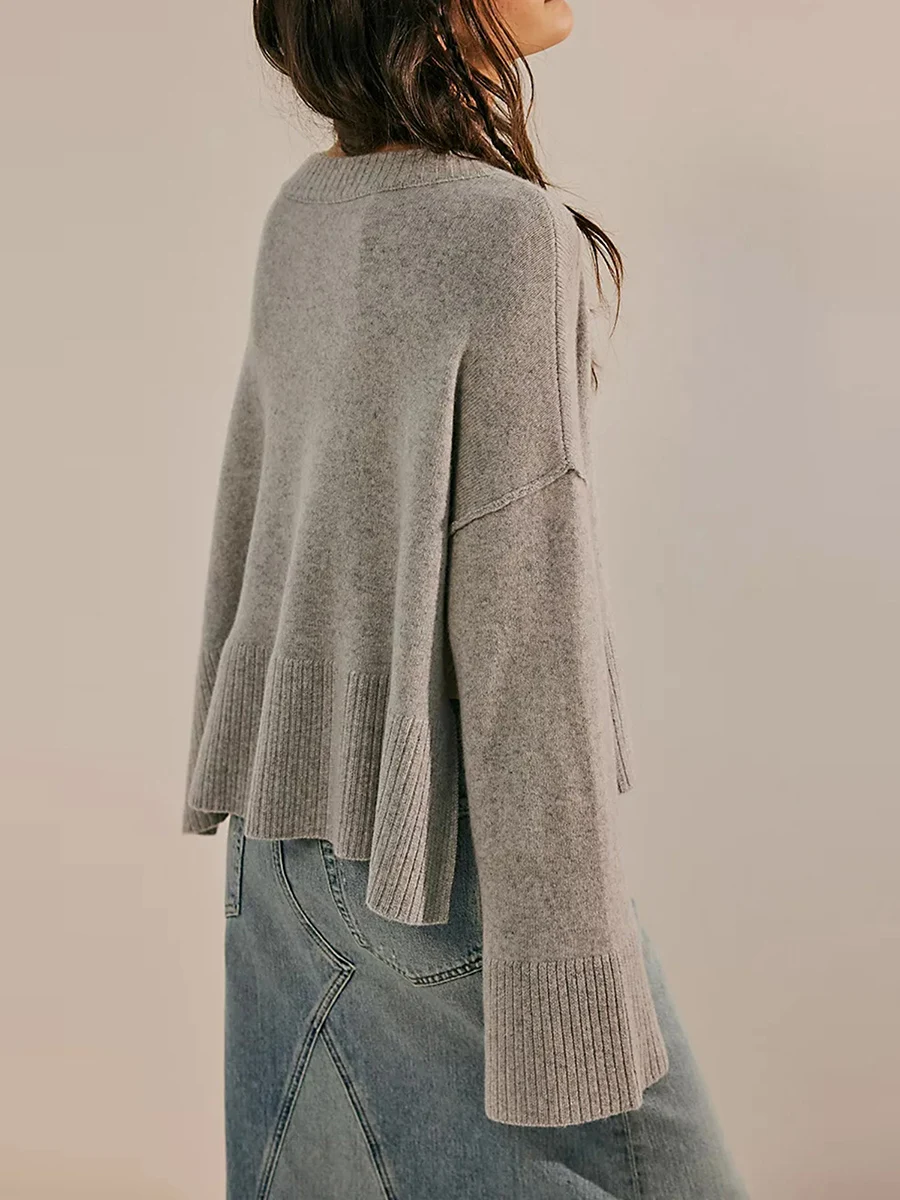 Women s Autumn Winter Knit Sweater Long Flared Sleeve Solid Color Loose Knitwear
