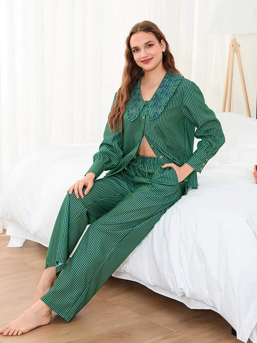 Women s Cozy Autumn Pajama Set with Striped Long Sleeve Top and Matching Pants Button Down Doll Collar Sleepwear