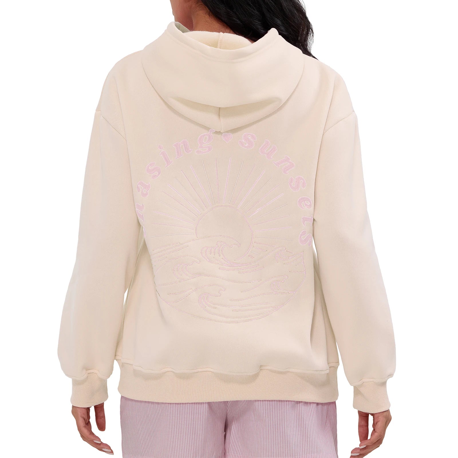 Lettered sunrise embroidered back adds a touch of fashion to your closet, long sleeves, hood, loose fit, casual style; Long sleeve sweatshirt for women; Cute hoodie for women, stylish and comfortable, ideal for your closet addition