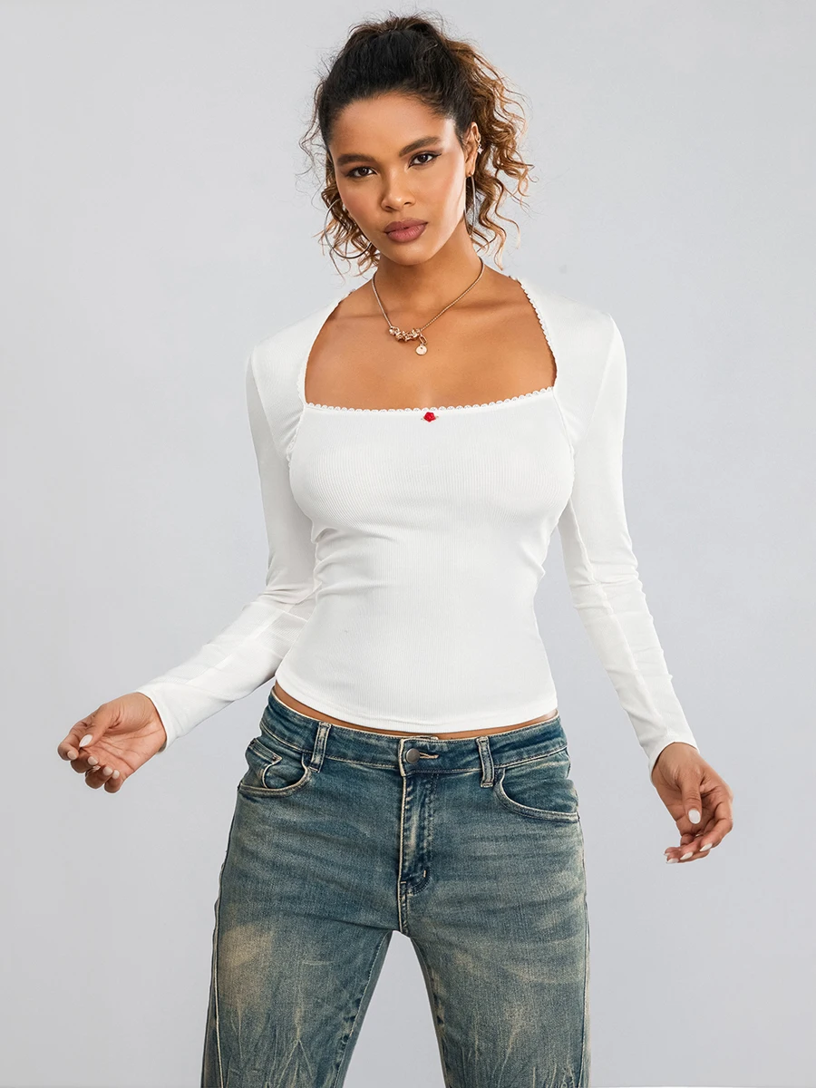 Women's Spring Sim Knit Tops, Solid Color Ribbed Long Sleeve Square Neck Mini Rose Decor ShirtsSize (cm)