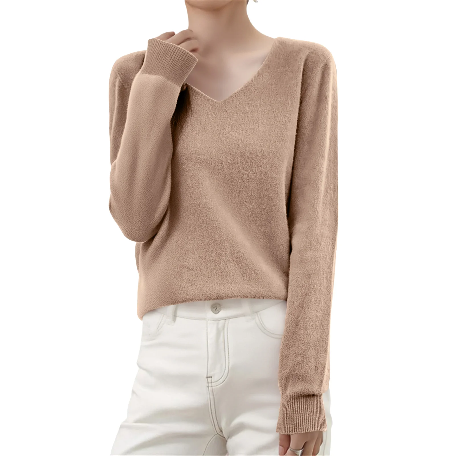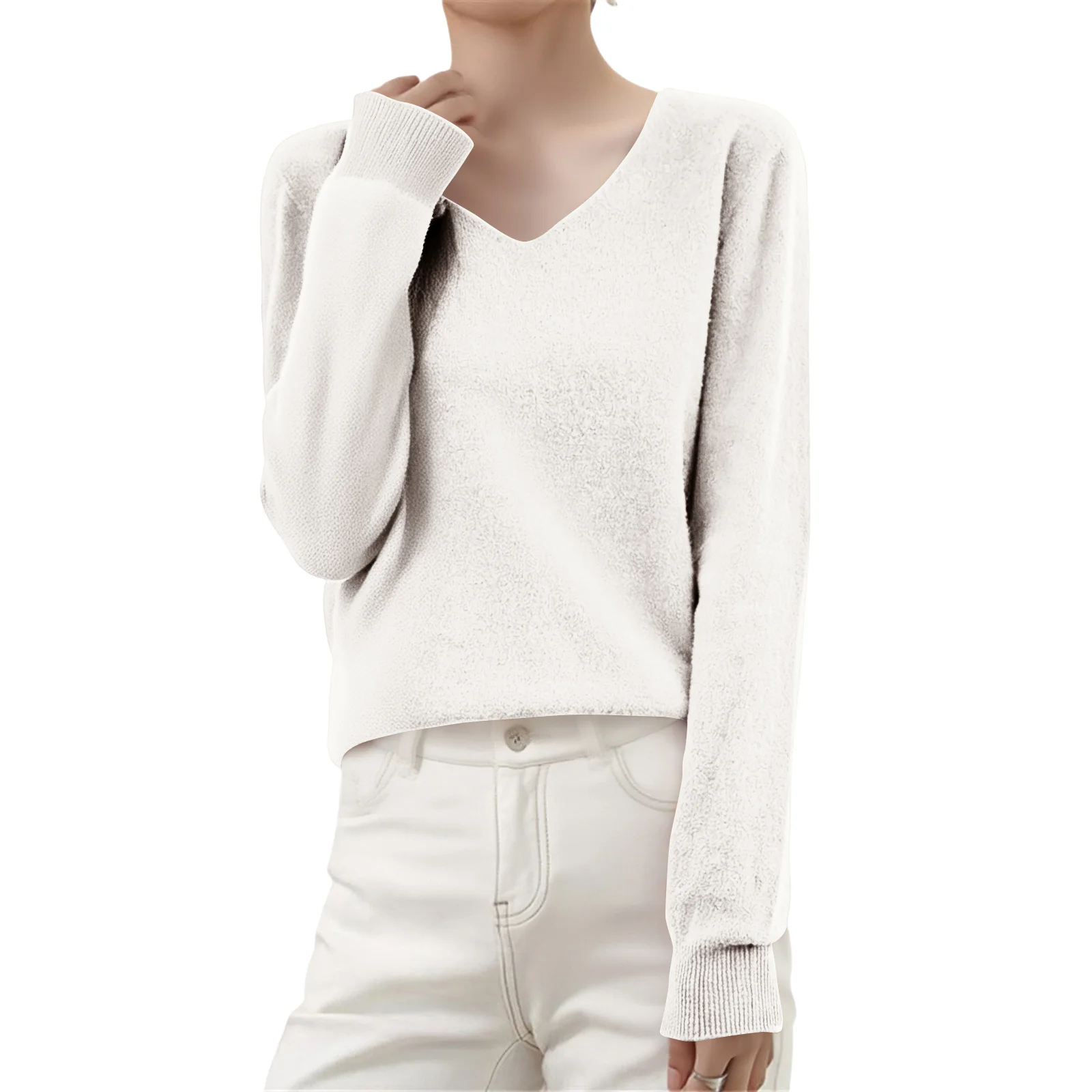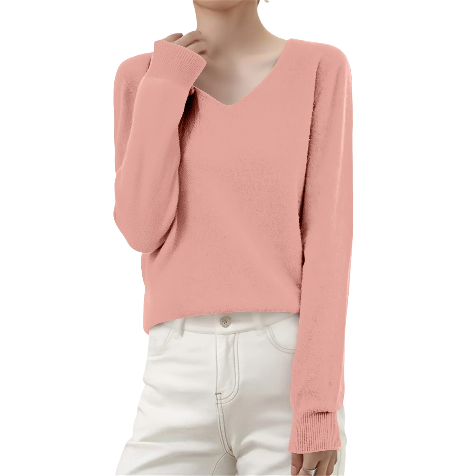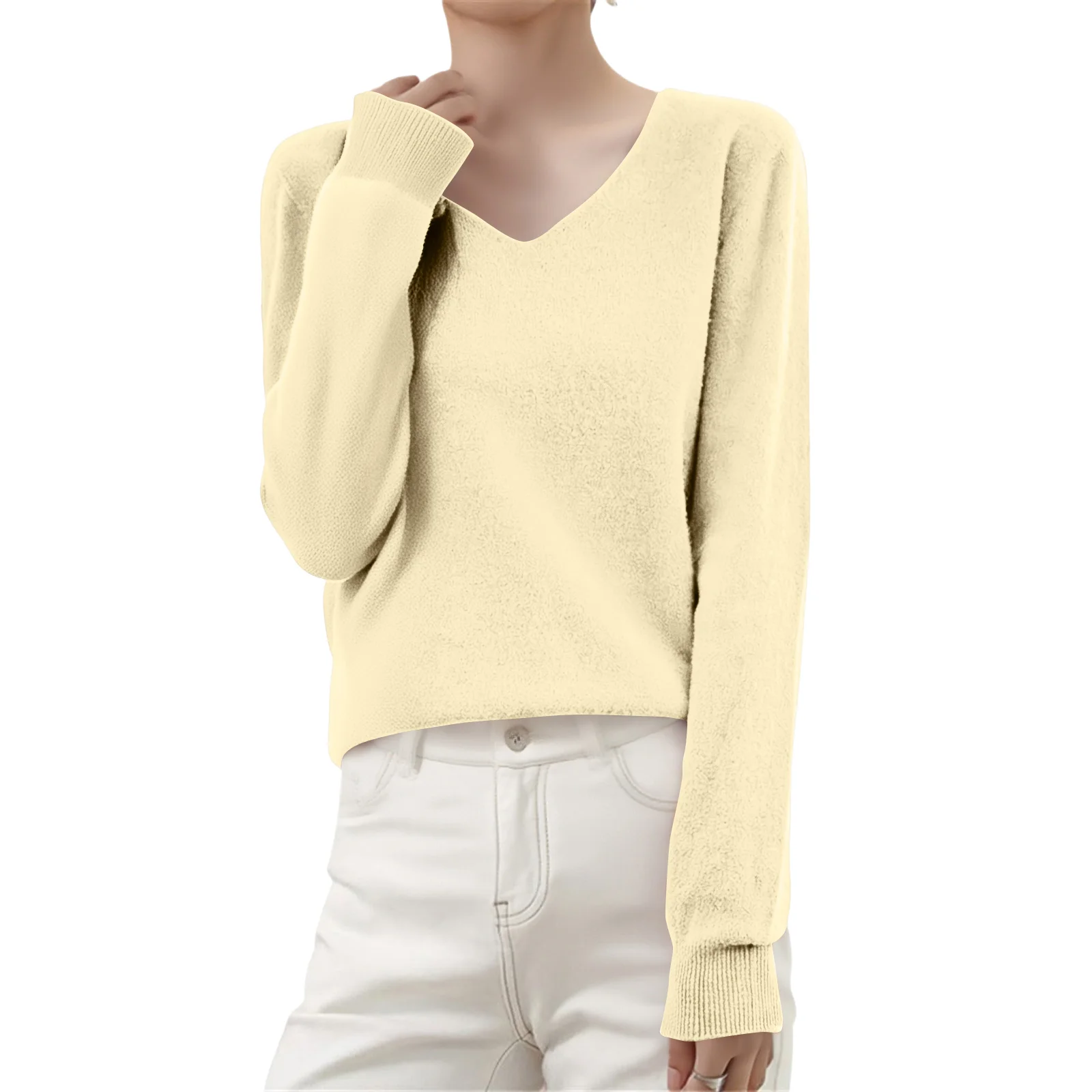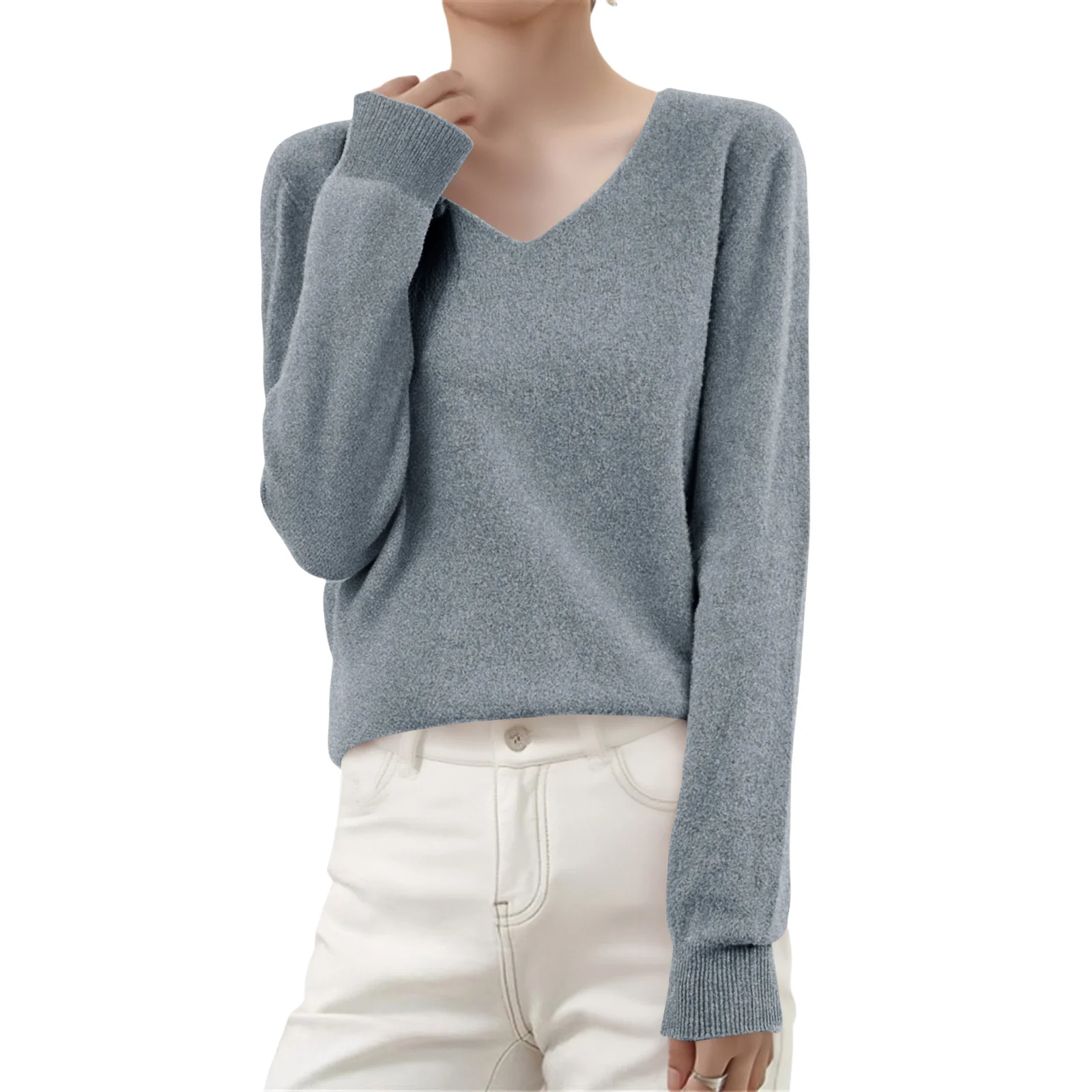 Women's Fashion Flat-Knit V-Neck Pullover Sweater Solid Color Long-Sleeve Top