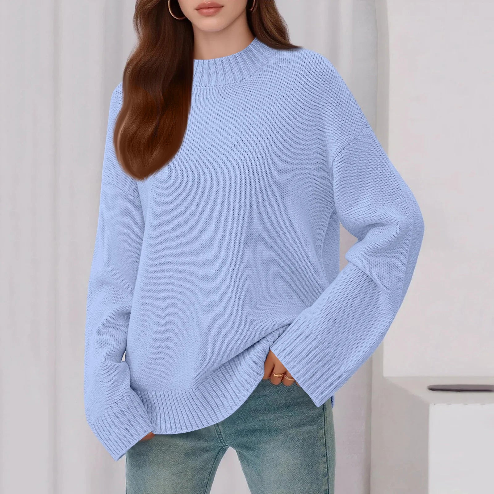 Womens Loose Round Neck Solid Color Bell Sleeve Long Sleeve Knitted Sweater Top Ropa De Mujer Sweater De Mujer Pull Femme