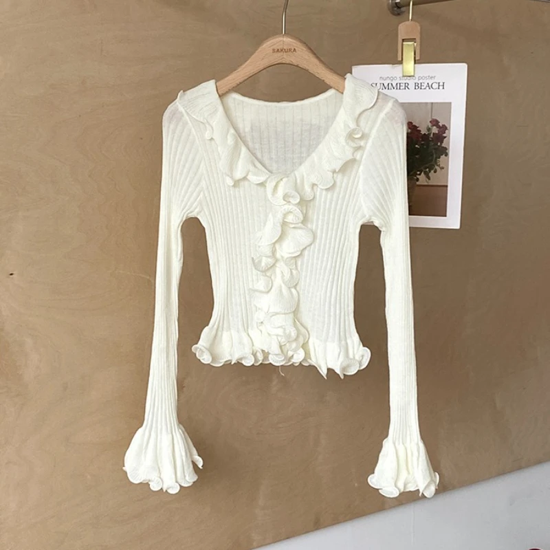 Women's Ruffled Sweater Long Sleeve Slim Fit Rib Knit Top Pullover Jumper Ladies Knitwear Autumn Winter Fairycore Outfit